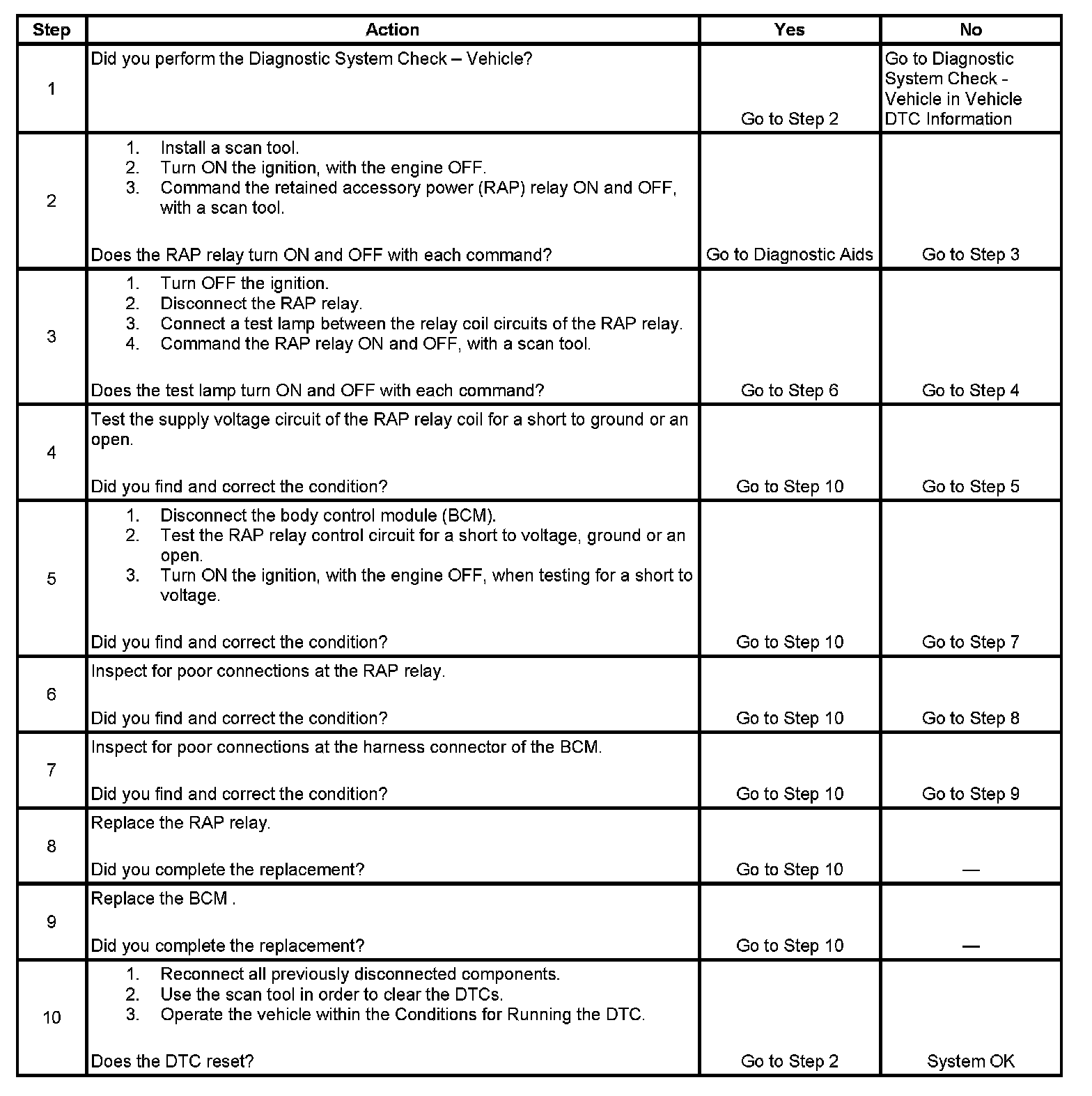 - The BCM detects a short to ground or an open in the RAP relay control circuit when the RAP relay is not energized.