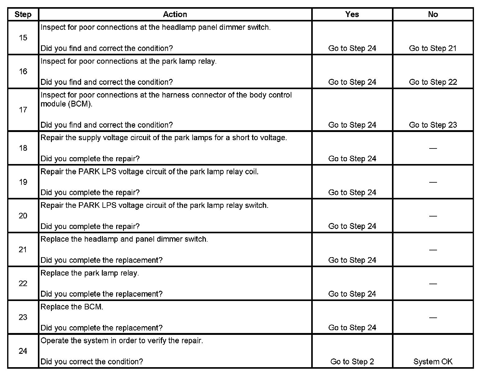 6. This step determines if a ground is constantly being applied to the park lamp relay.