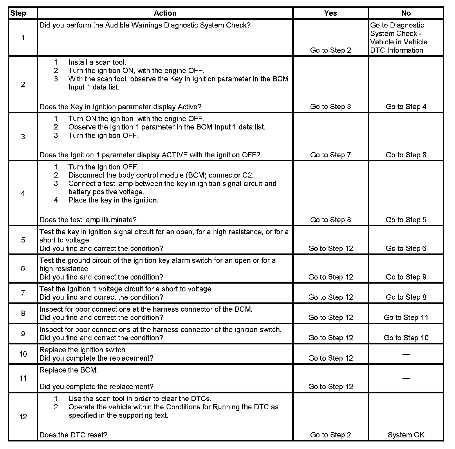 The body control module (BCM) monitors the ignition key alarm switch. When the key is in the ignition, the ignition key alarm switch is closed and the signal circuit is low. When the key is not in the ignition, the ignition key alarm switch is open and the signal circuit is high.