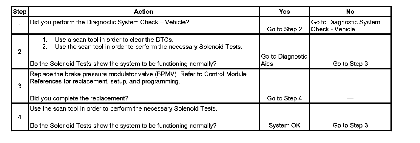 2. Performing solenoid tests determines if there is a mechanical malfunction inside the Brake Pressure Modulator Valve (BPMV). Perform dump valve solenoid tests for DTC C0269 or isolation valve solenoid tests for DTC C0274.
