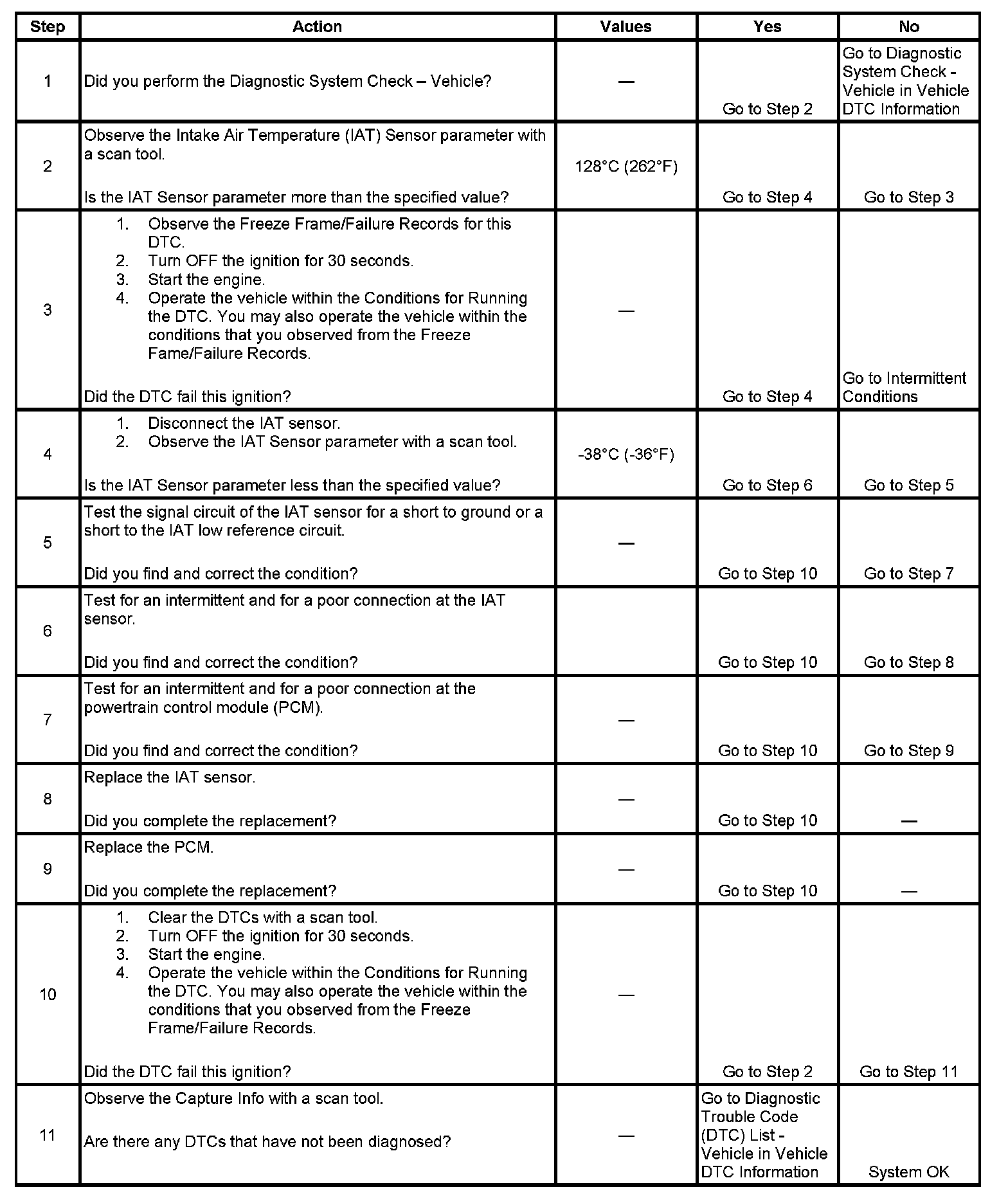 The powertrain control module (PCM) detects that the IAT is more than 128°C (262°F) for 12.5 seconds.