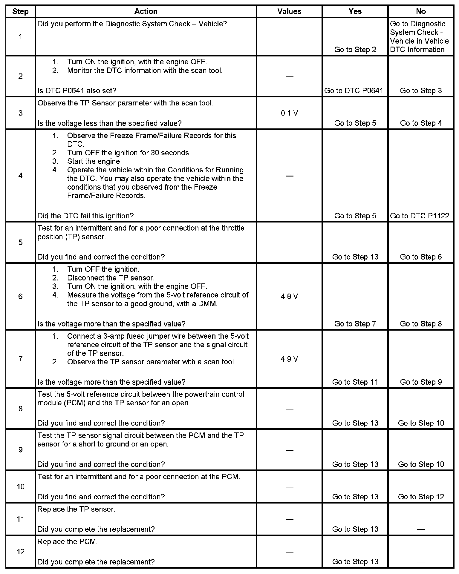 The PCM provides the TP sensor with 5 volts on the 5-volt reference circuit and a ground on the low reference circuit. Rotation of the TP sensor rotor from the closed throttle position to the wide open throttle (WOT) position provides the PCM with a signal voltage from less than 1 volt to more than 4 volts through the TP sensor signal circuit. If the PCM detects an excessively low signal voltage, DTC P0122 sets.