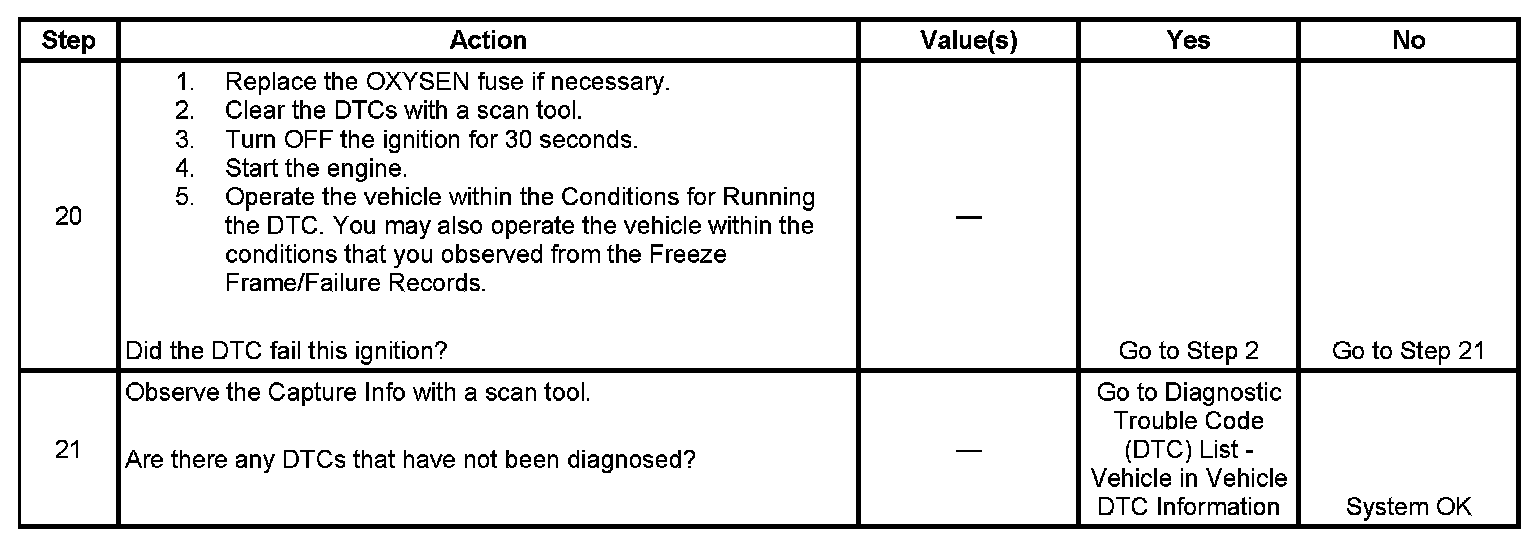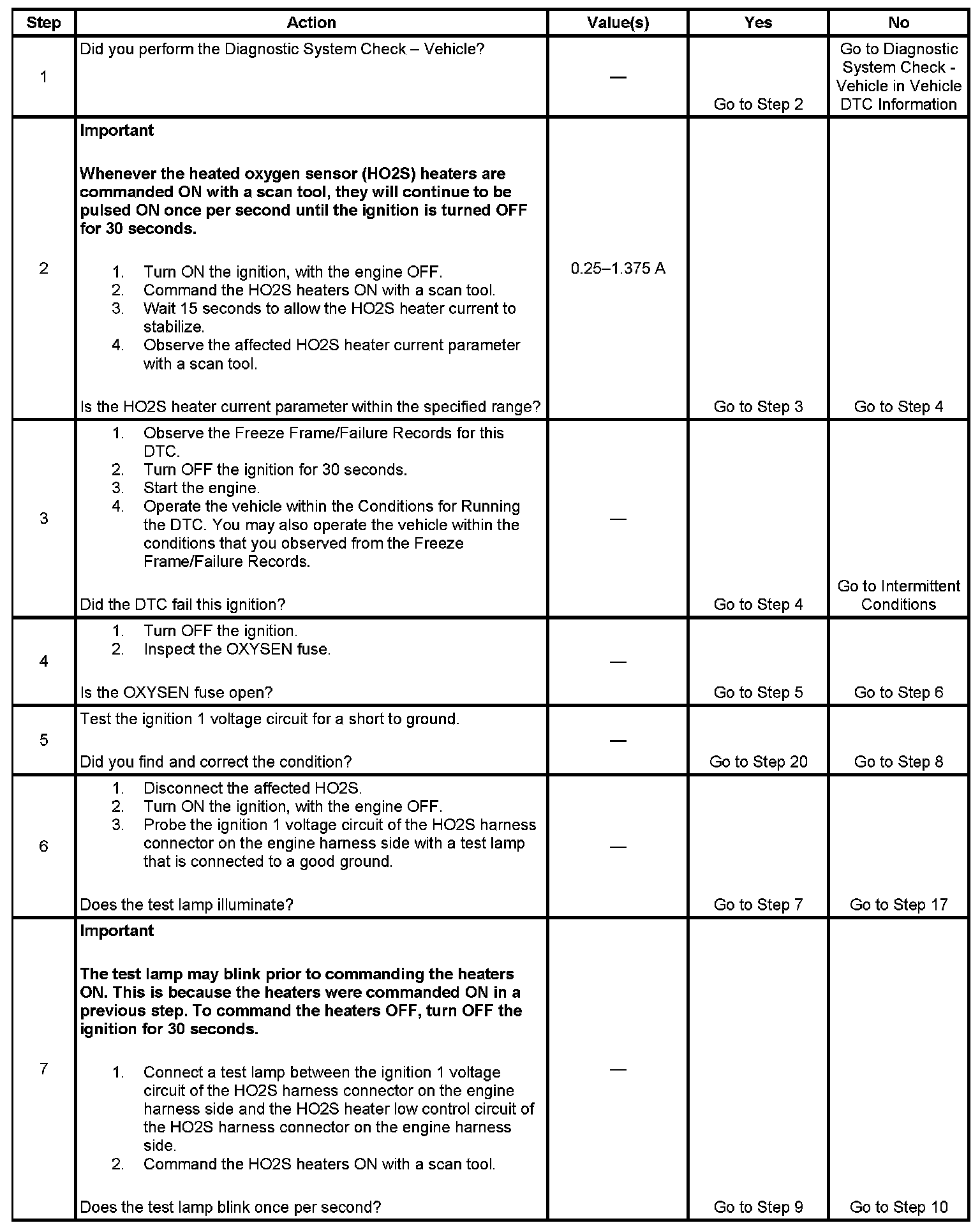 The heated oxygen sensor (HO2S) must reach operating temperature to provide an accurate voltage signal. A heating element inside the HO2S minimizes the time required for the sensor to reach operating temperature. Voltage is provided to the heater by the ignition 1 voltage circuit through a fuse. With the engine running, ground is provided to the heater by the HO2S heater low control circuit, through a low side driver within the powertrain control module (PCM). The PCM commands the heater ON or OFF to maintain a specific HO2S operating temperature range. The PCM determines the temperature by measuring the current flow through the heater. When the heater is in the ON state, the PCM will pulse the heater OFF for a duration of 50 ms, once per second. When the heater is in the OFF state, the PCM will pulse the heater ON for a duration of 50 ms, once per second. The PCM monitors the heater current with the engine running. This diagnostic will only run once per ignition cycle. If the PCM detects that the heater current is not within an expected range, the following DTCs will set: