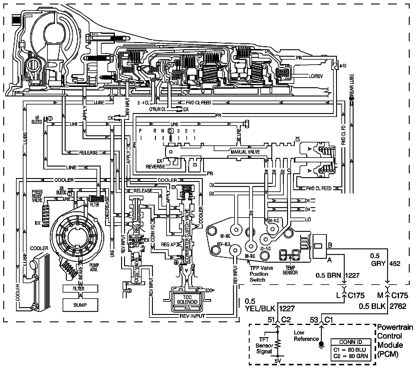 The flow of transmission fluid starts in the bottom pan and is drawn through the filter, control valve body assembly, transmission case and into the oil pump assembly. The oil pump assembly pressurizes the fluid and directs it to the pressure regulator valve where it becomes the main supply of fluid to the various components and hydraulic circuits in the transmission. Hot fluid exiting the torque converter flows through the converter clutch apply valve and into the transmission cooler lines to the oil cooler located in the vehicle radiator, and auxiliary cooler if equipped. From the cooler, fluid returns to cool and lubricate the front of the transmission. In forward drive ranges, D4 fluid from the manual valve is routed through an orificed cup plug in the rear of the transmission case to feed the rear lube fluid circuit.