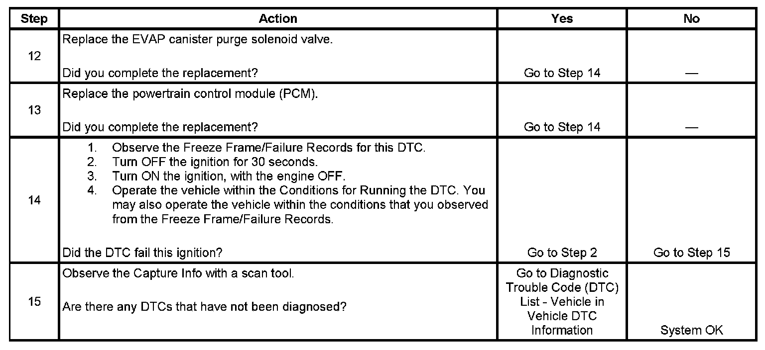 An ignition voltage is supplied directly to the evaporative emission (EVAP) canister purge solenoid valve. The EVAP canister purge solenoid valve is pulse width modulated (PWM). The scan tool displays the amount of ON time as a percentage. The control module monitors the status of the driver. The control module controls the EVAP canister purge solenoid valve ON time by grounding the control circuit via an internal switch called a driver. If the control module detects an incorrect voltage for the commanded state of the driver, this DTC sets.