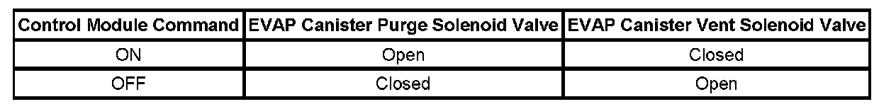 The table illustrates the relationship between the ON and OFF states, and the Open or Closed states of the EVAP canister purge and vent solenoid valves.