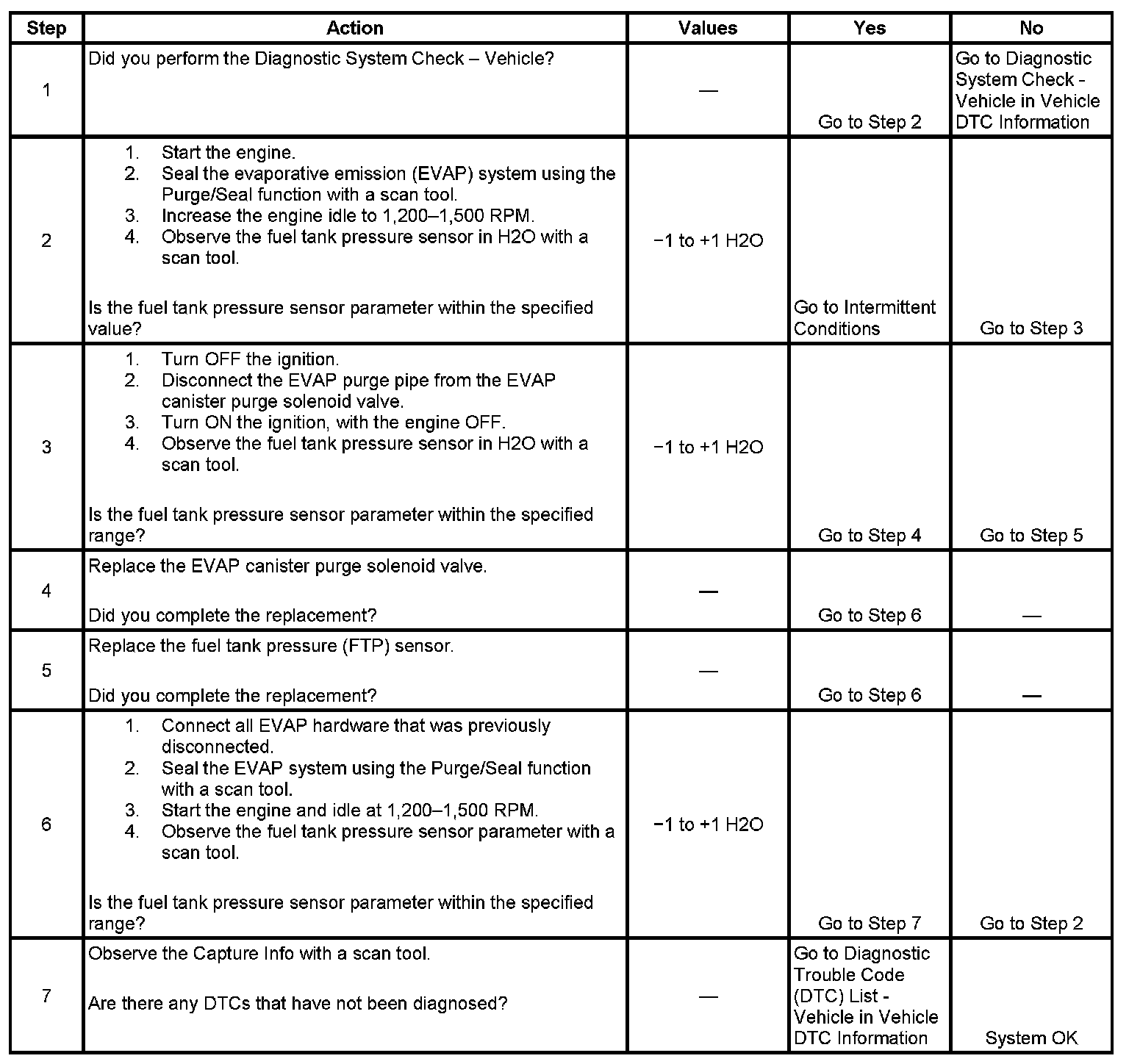 This DTC tests for undesired intake manifold vacuum flow to the evaporative emission (EVAP) system. The control module seals the EVAP system by commanding the EVAP canister purge solenoid valve Closed and the EVAP canister vent solenoid valve Closed. The control module monitors the fuel tank pressure (FTP) sensor to determine if a vacuum is being drawn on the EVAP system. If vacuum in the EVAP system is more than a predetermined value within a predetermined time, this DTC sets.