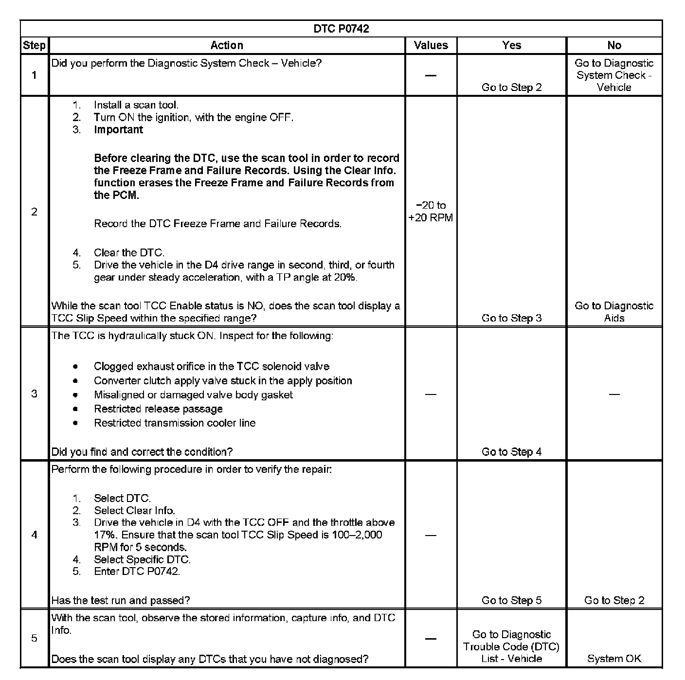 When the PCM detects low TCC slip when the TCC is commanded OFF, then DTC P0742 sets. DTC P0742 is a type B DTC.