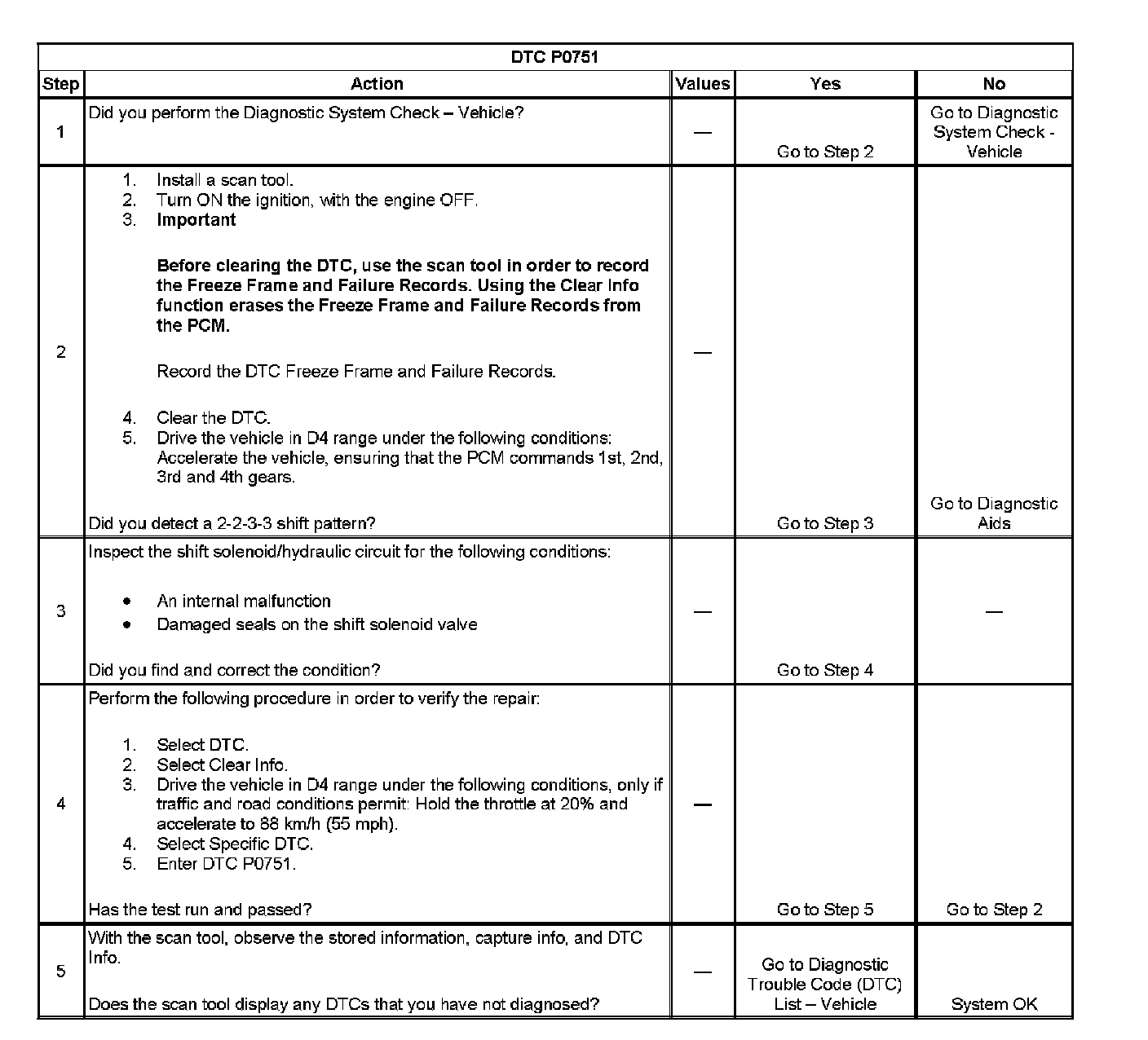 When the powertrain control module (PCM) detects a 2-2-3-3 shift pattern, then DTC P0751 sets. DTC P0751 is a type B DTC.