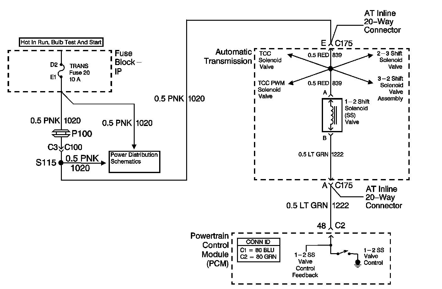 The 1-2 shift solenoid (SS) valve controls the fluid flow acting on the 1-2 and 3-4 shift valves. The solenoid is a normally-open exhaust valve. With the 2-3 SS valve, the 1-2 SS valve allows four different shifting combinations. The solenoid attaches to the control valve body within the transmission. The 1-2 SS valve receives ignition voltage through the ignition 0 voltage circuit. The powertrain control module (PCM) controls the solenoid by providing the ground path on the 1-2 SS valve control circuit.