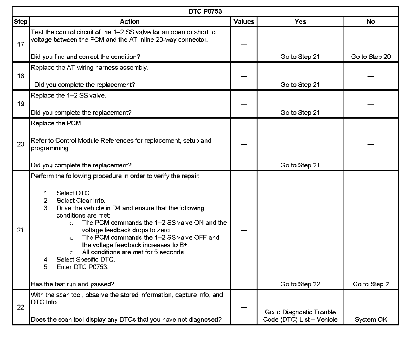 When the PCM detects a continuous open, short to ground or short to voltage in the 1-2 SS valve circuit, then DTC P0753 sets. DTC P0753 is a type B DTC.