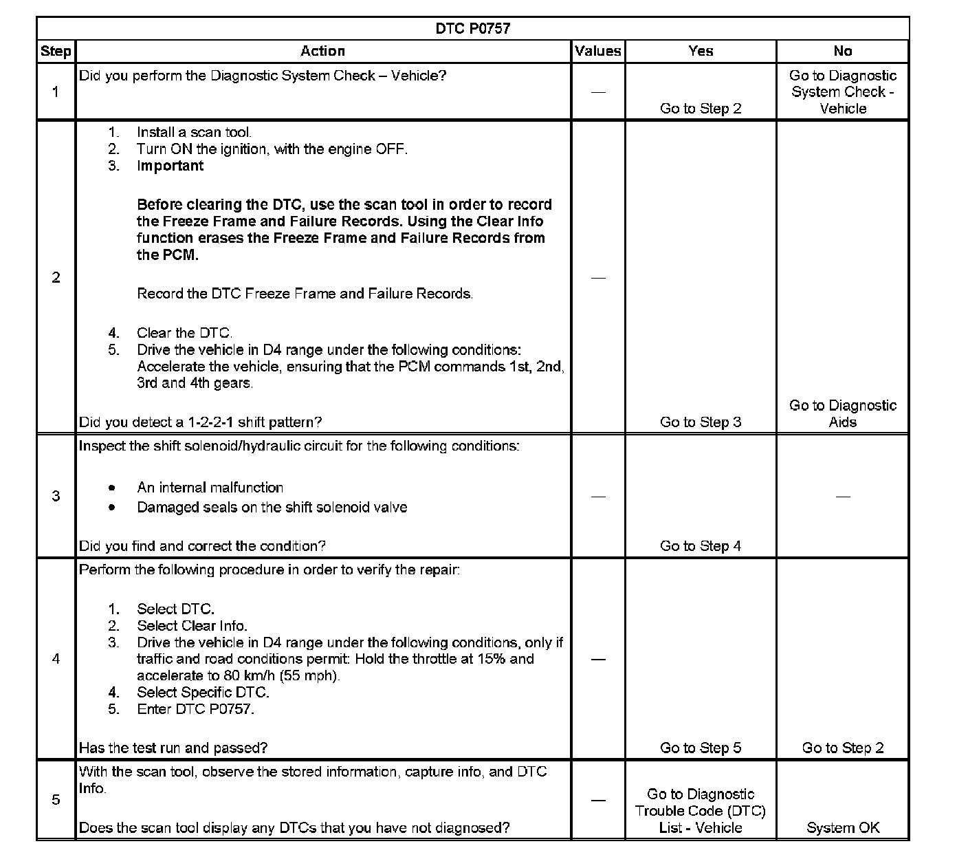 When the powertrain control module (PCM) detects a 1-2-2-1 shift pattern, then DTC P0757 sets. DTC P0757 is a type A DTC.
