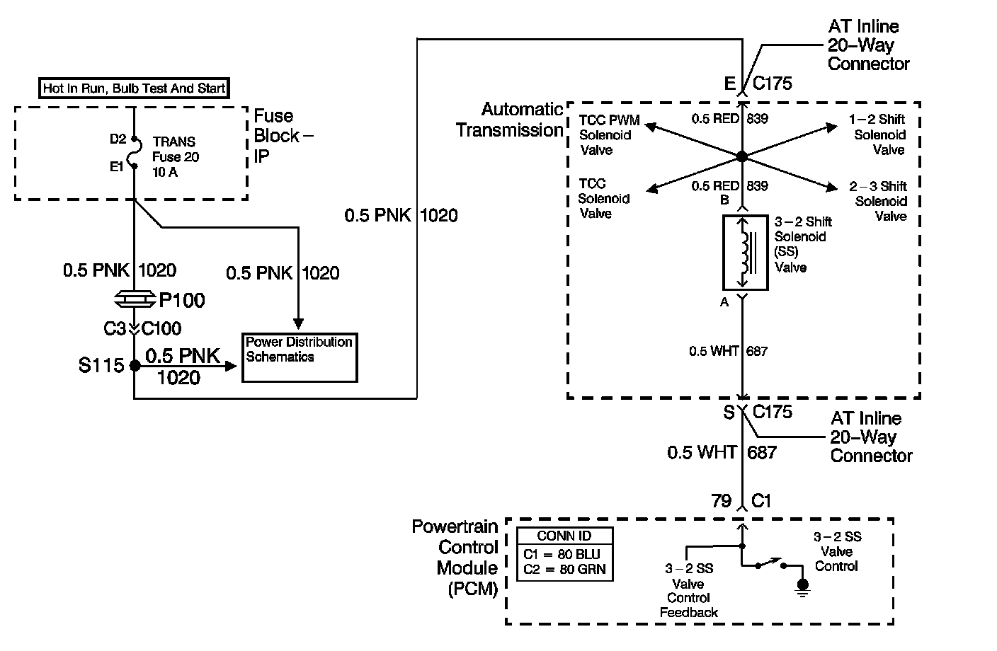 The 3-2 shift solenoid (SS) valve assembly is a normally-closed, 3-port, on/off device that controls the 3-2 downshift. The solenoid attaches to the control valve body within the transmission. The solenoid receives ignition voltage through the ignition 0 voltage circuit. The powertrain control module (PCM) controls the solenoid by providing a ground path on the 3-2 SS valve control circuit. During a 3-2 downshift, the 2-4 band applies as the 3-4 clutch releases. The PCM varies the timing between the 3-4 clutch release and the 2-4 band apply, depending on the vehicle speed and the throttle position.