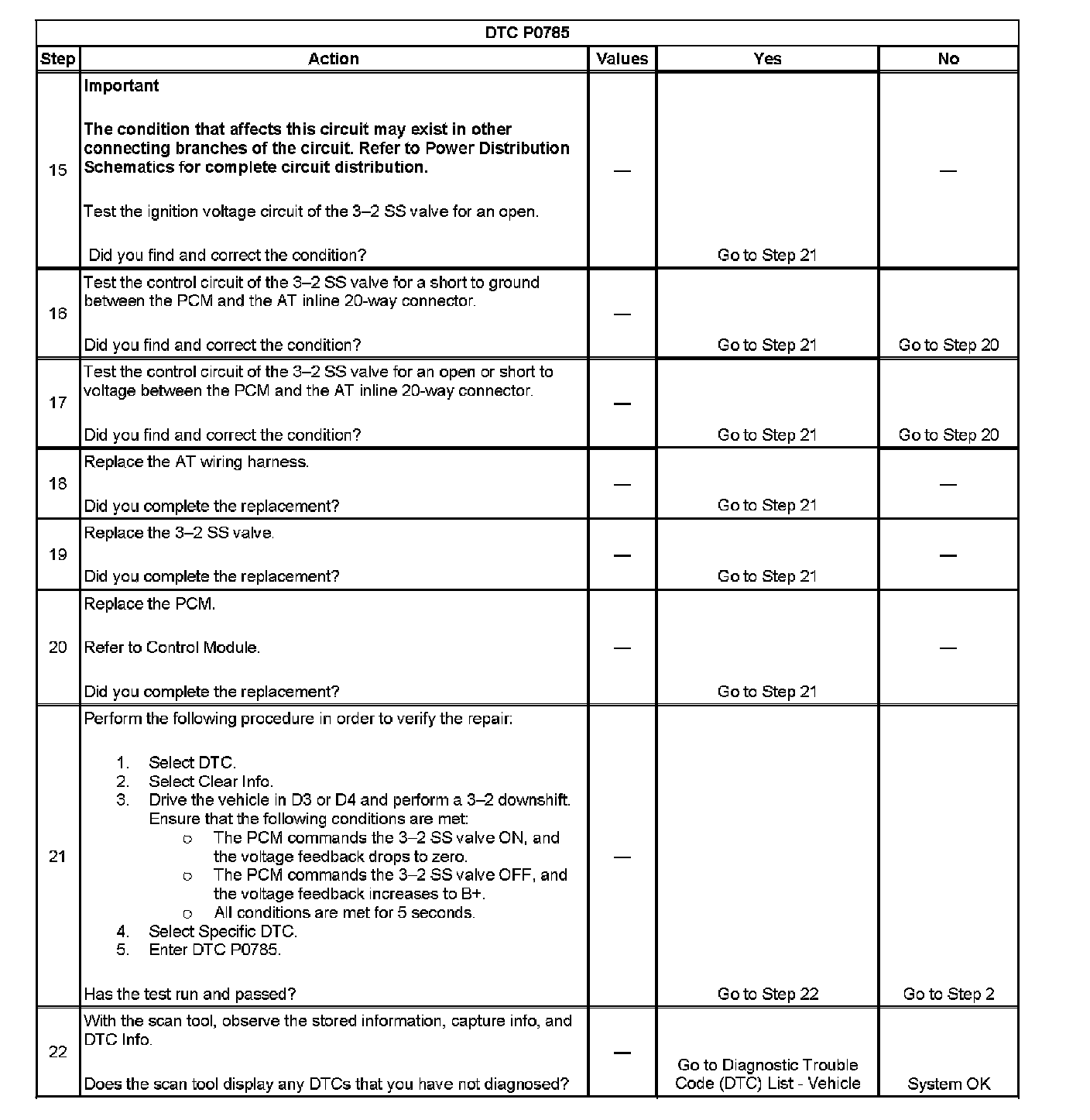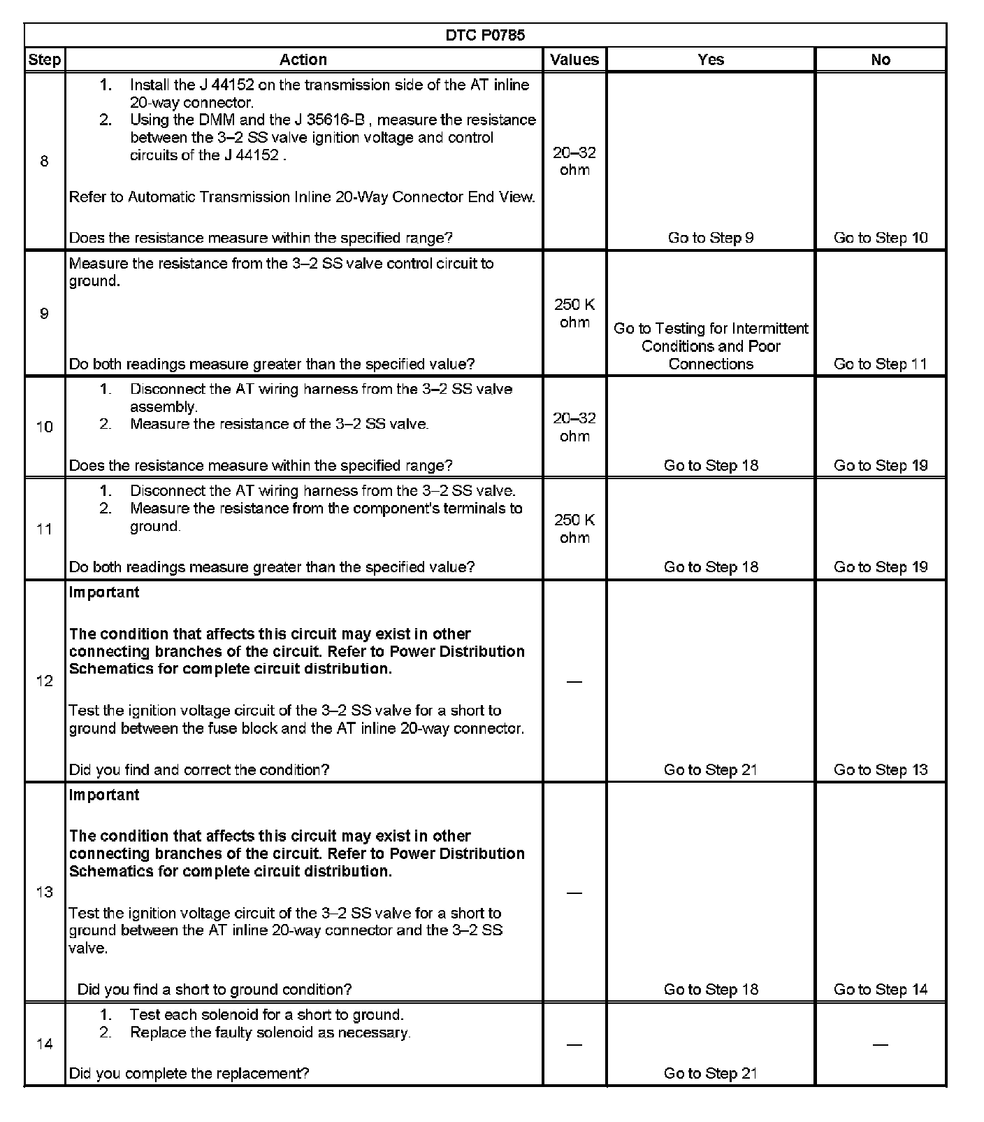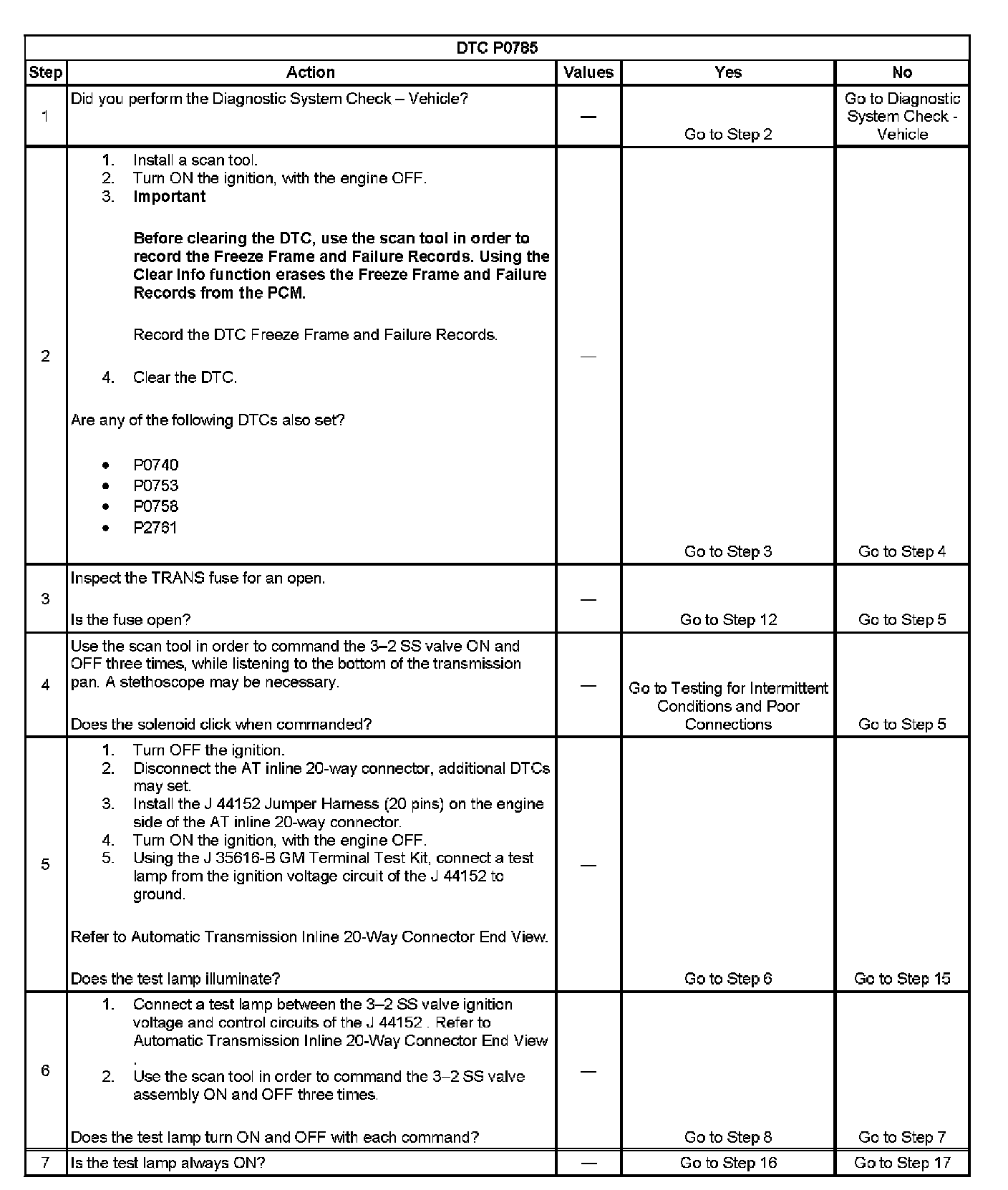 When the PCM detects a continuous open, short to ground or short to voltage in the 3-2 SS valve circuit, then DTC P0785 sets. DTC P0785 is a type B DTC.