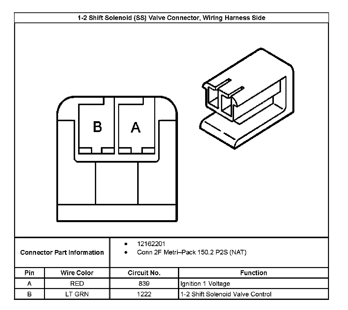 1-2 Shift Solenoid (SS) Valve Connector End View, Wiring Harness Side: