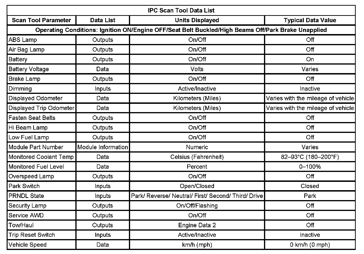 Scan Tool Data List - Instrument Panel Cluster (IPC)