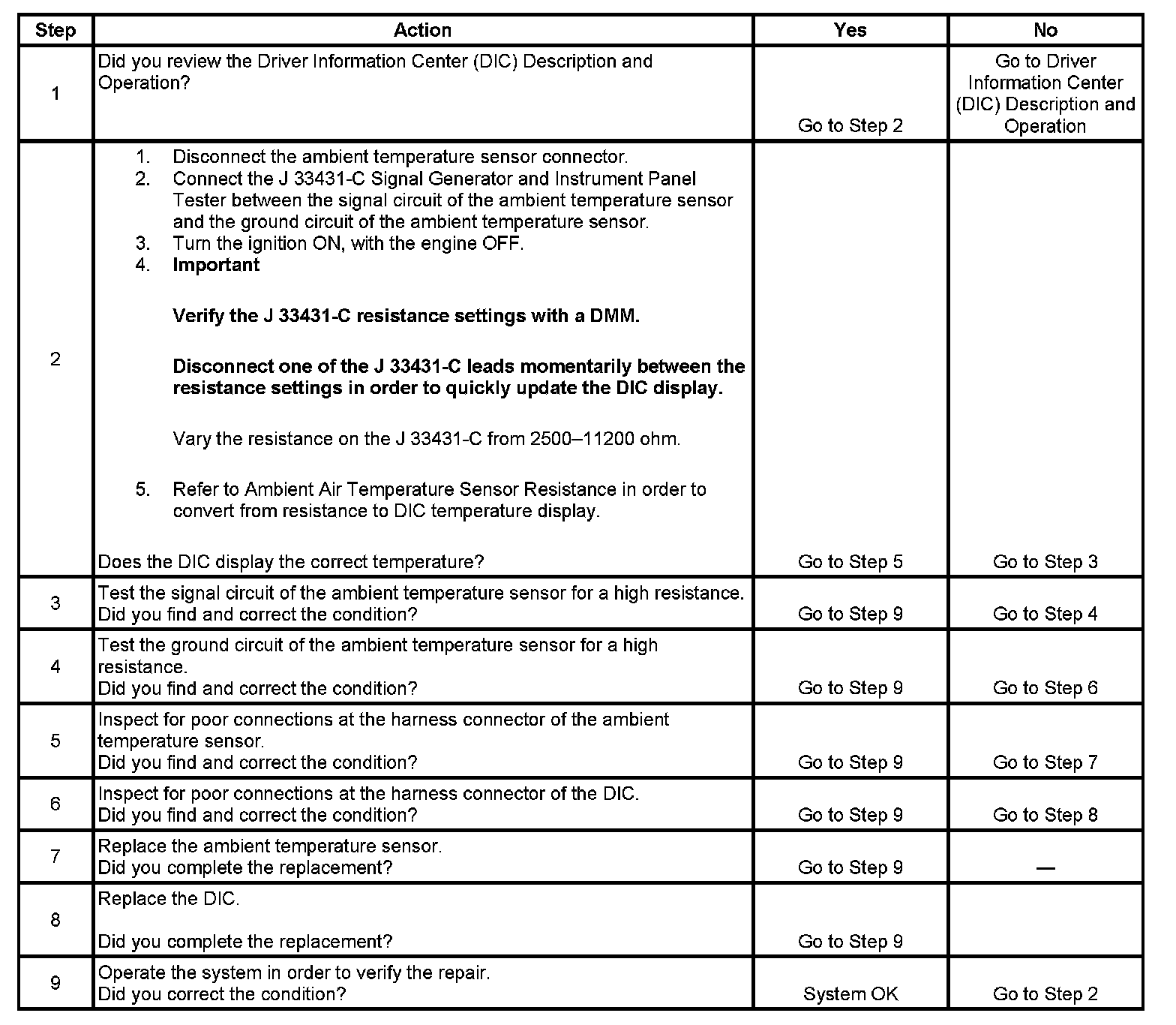 - Refer to Ambient Air Temperature Sensor Resistance in order to verify the correct ambient temperature sensor readings.