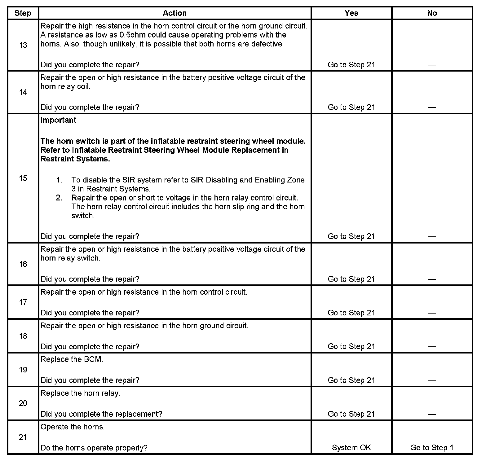 13. The horns need maximum current flow to operate properly. A high resistance, greater than 0.5ohm, in the horn control circuit or the horn ground circuit could cause operating problems with the horns. Inspect the circuits for faults that would restrict current flow.