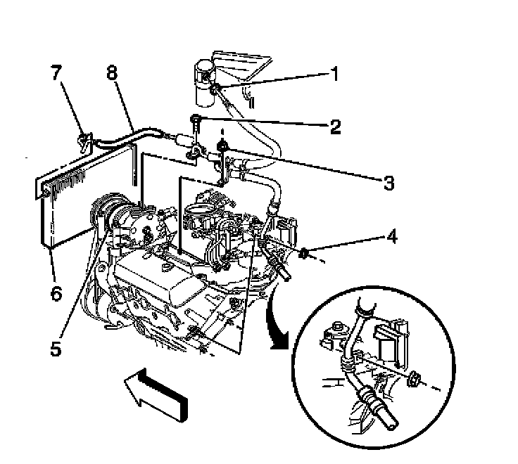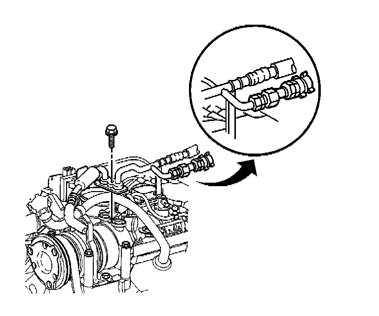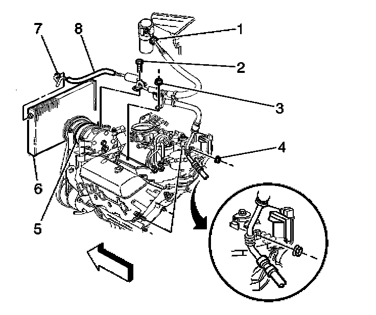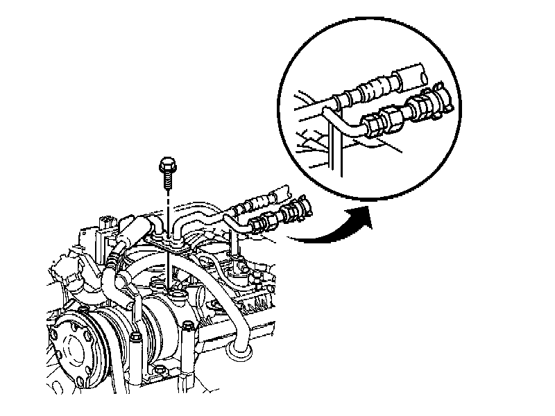 8. Remove the nut that attaches the compressor hose assembly bracket to the engine.