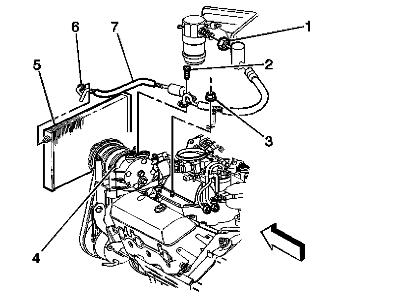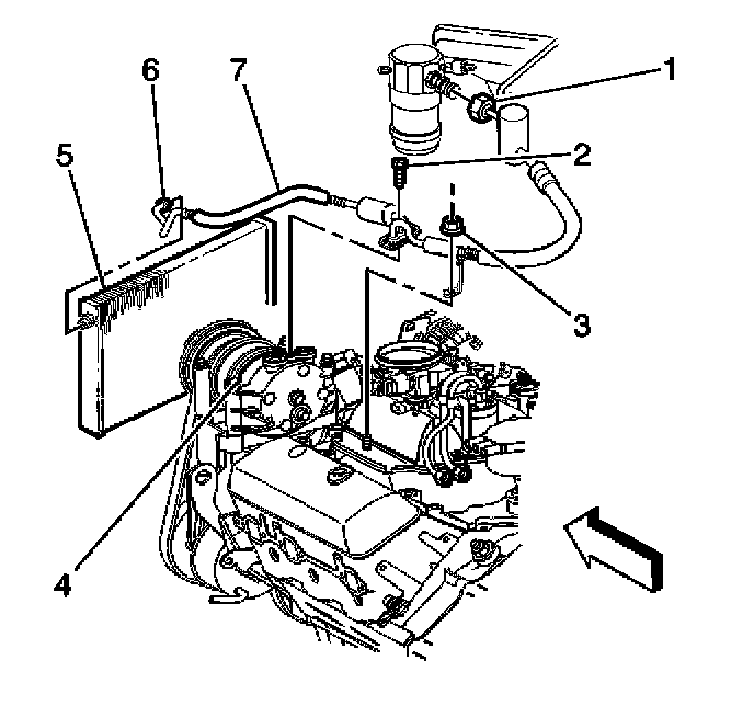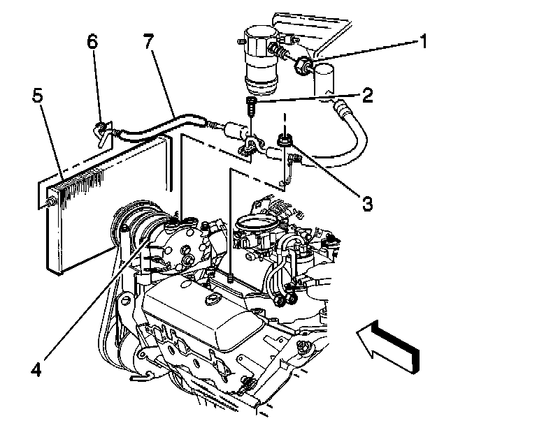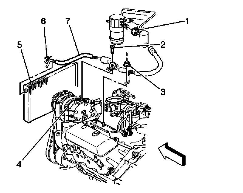 12. Remove the compressor hose assembly nut (6) from the condenser.