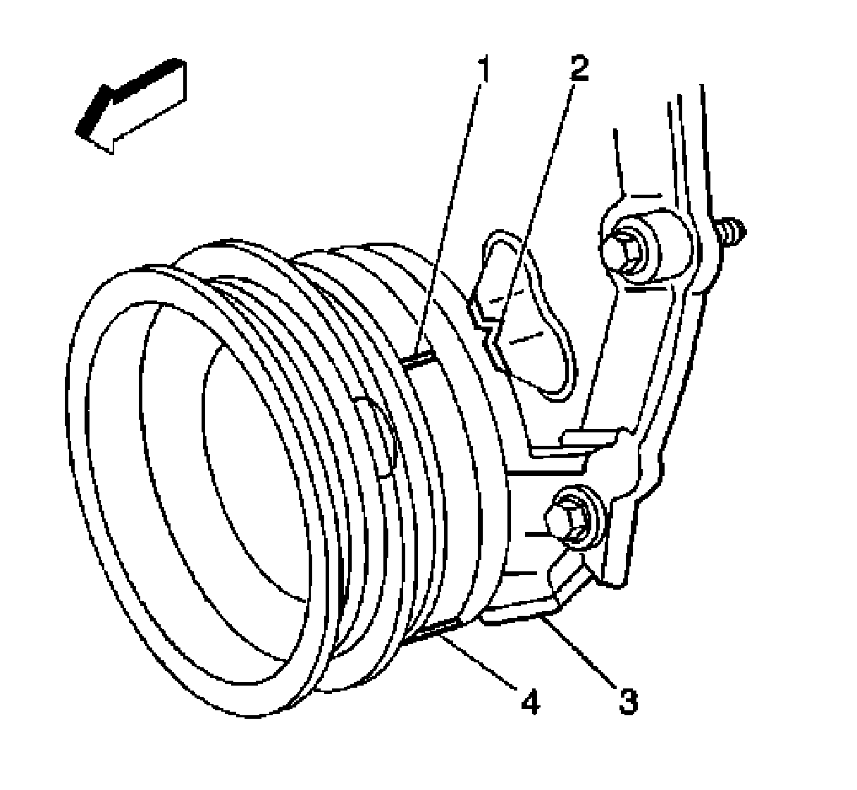 IMPORTANT: Rotate the number 1 cylinder to top dead center (TDC) of the compression stroke. The engine front cover has 2 alignment tabs and the crankshaft balancer has 2 alignment marks spaced 90 degrees apart which are used for positioning the number 1 piston at TDC. With the piston on the compression stroke and at TDC, the crankshaft balancer alignment mark (1) must align with the engine front cover tab (2) and the crankshaft balancer alignment mark (4) must align with the engine front cover tab (3).