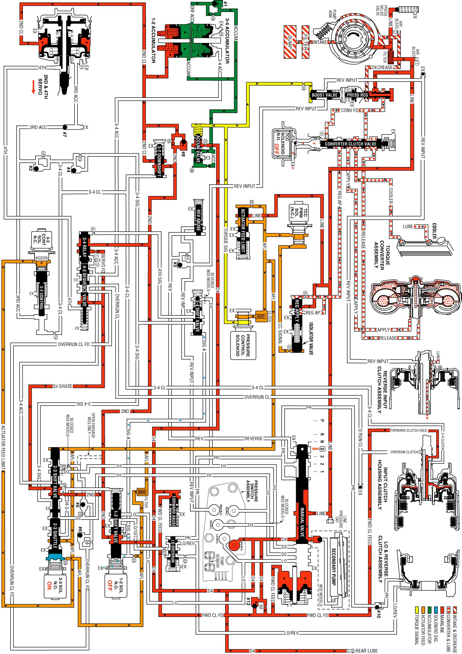 In D4 second gear, the 2-3 SS valve is energized and the 2-3 shift valve train is in the downshift position normally allowing overrun clutch circuit to exhaust. With the spacer plate redirecting the D2 oil, the overrun clutch can be applied.