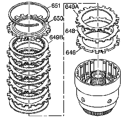 1. Inspect the forward clutch waved plate (648), the apply plate (646), the fiber plate assemblies (649B), the steel plates (649A) and the selective backing plate (650) for the following conditions: