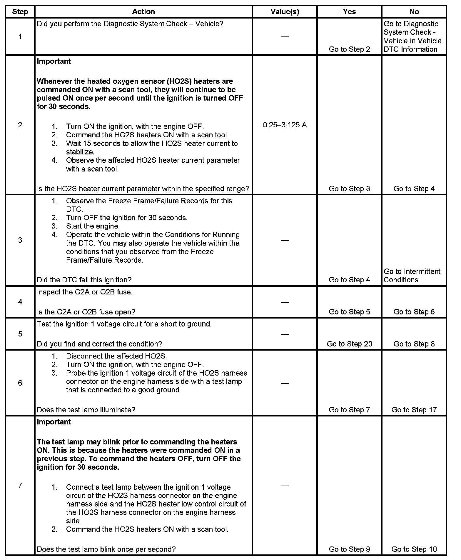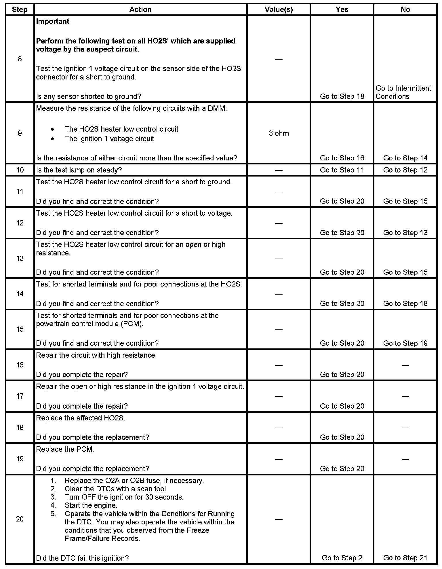 The heated oxygen sensor (HO2S) must reach operating temperature to provide an accurate voltage signal. A heating element inside the HO2S minimizes the time required for the sensor to reach operating temperature. Voltage is provided to the heater by the ignition 1 voltage circuit through a fuse. With the engine running, ground is provided to the heater by the HO2S heater low control circuit, through a low side driver within the powertrain control module (PCM). The PCM commands the heater ON or OFF to maintain a specific HO2S operating temperature range. The PCM determines the temperature by measuring the current flow through the heater. When the heater is in the ON state, the PCM will pulse the heater OFF for a duration of 50 ms, once per second. The PCM calculates the heater resistance on a cold start. This diagnostic will only run once per ignition cycle. If the PCM detects that the heater calculated resistance is not within the expected range, the following DTCs will set: