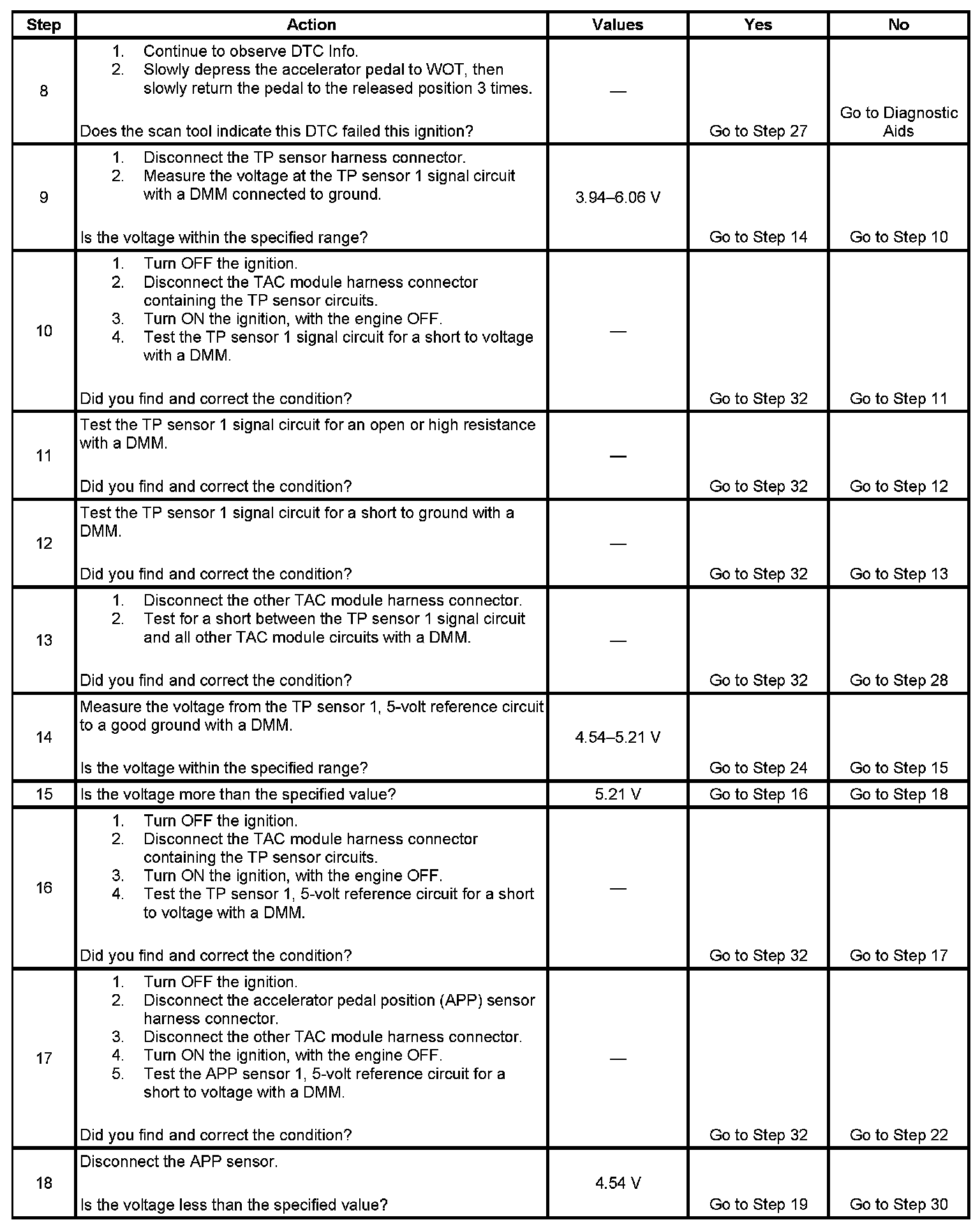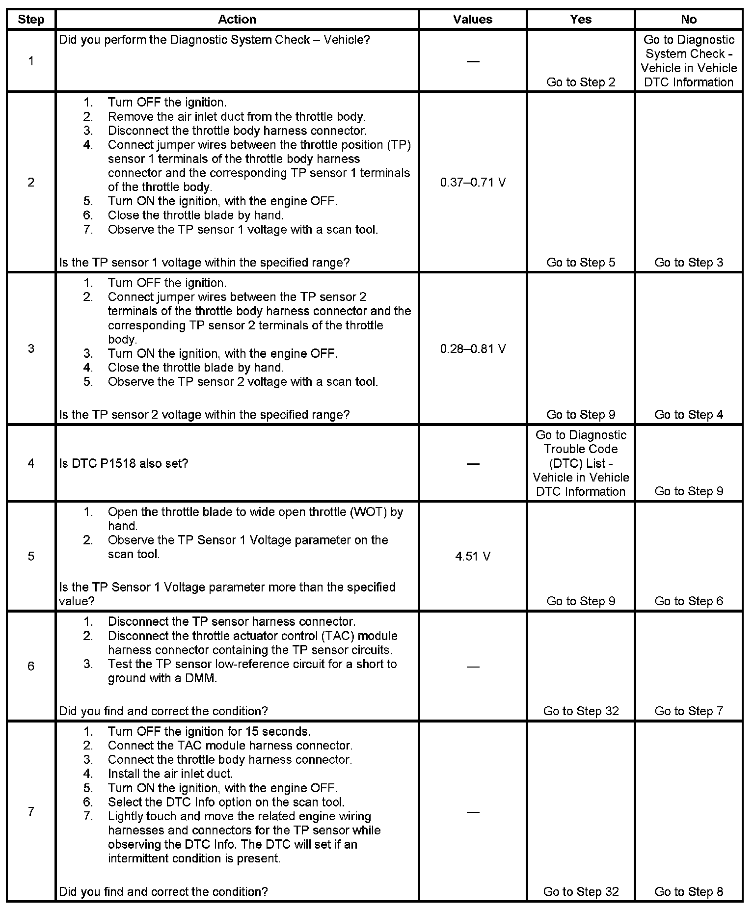 - The TP sensor 1 signal voltage is less than 0.37 volt or more than 4.51 volts.