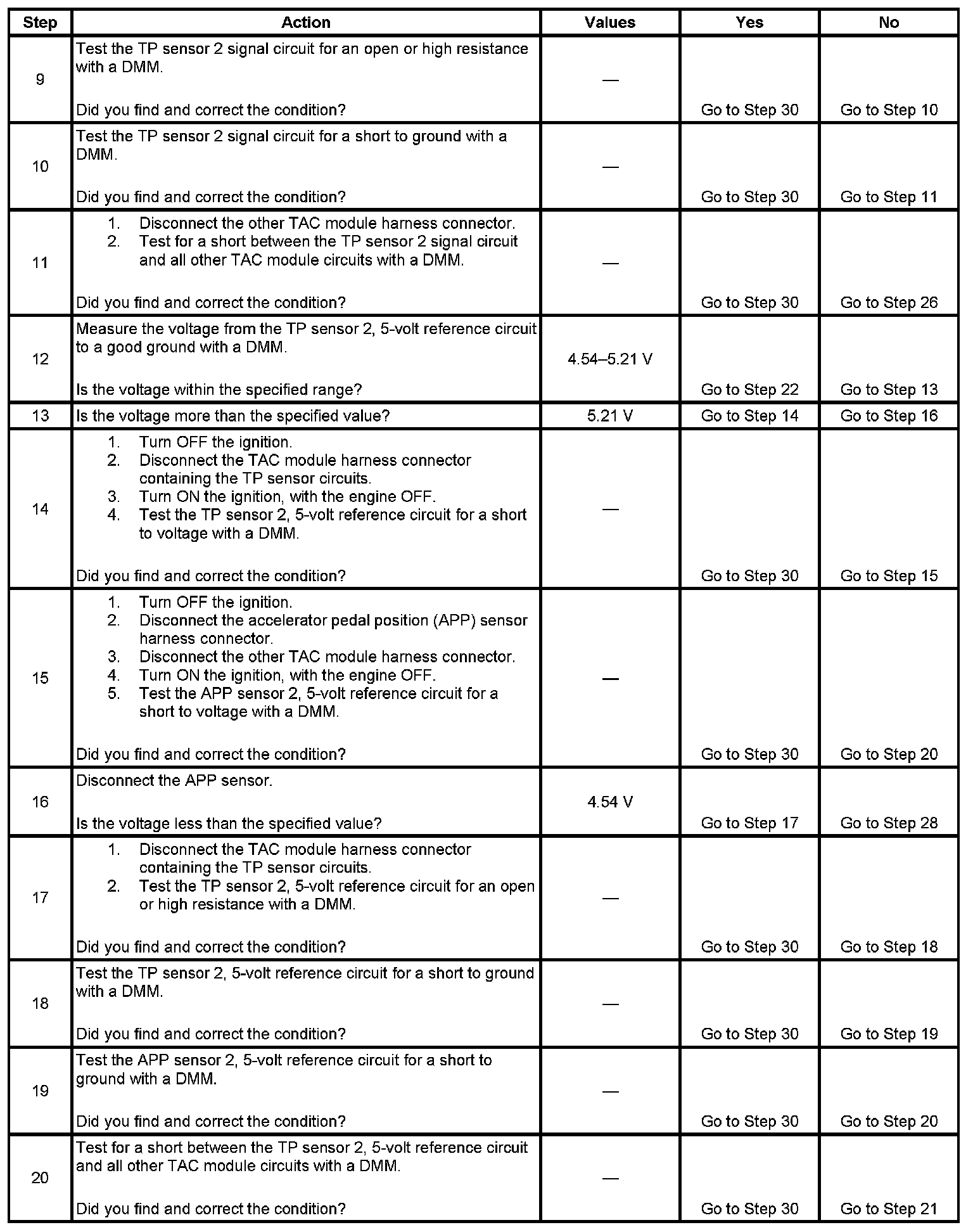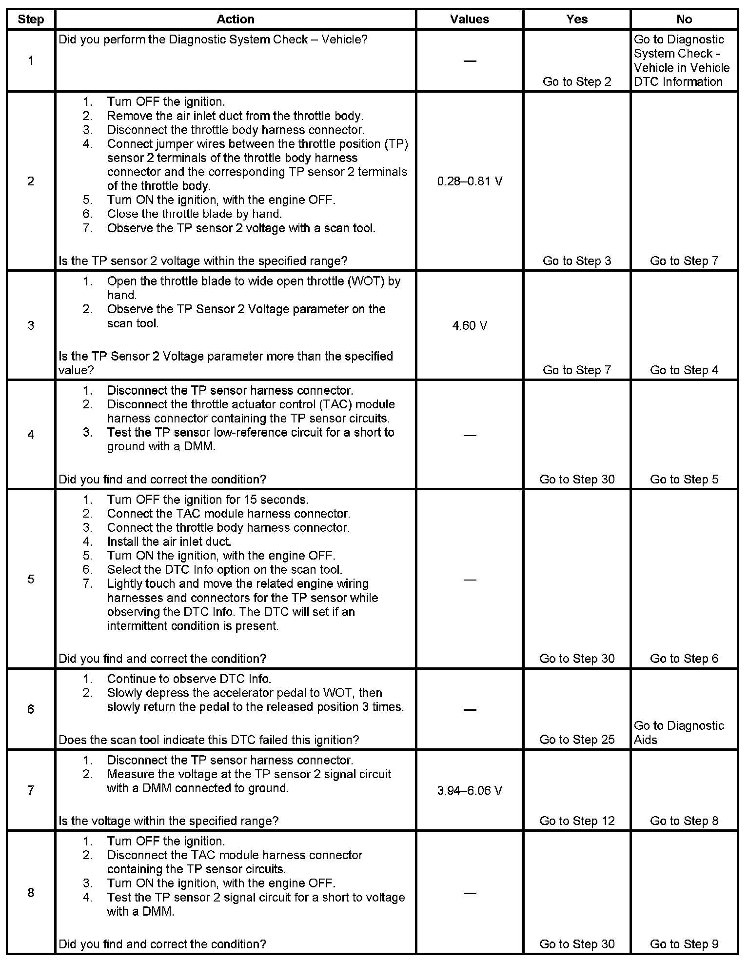 The TP sensor is used to determine the throttle plate angle for various engine management systems. The control module provides the TP sensor with a 5-voltreference circuit and a low reference circuit. The TP sensor then provides the control module with a signal voltage proportional to throttle plate movement. TP sensor 1 signal voltage is low at closed throttle and increases as the throttle opens. When the control module detects that the TP sensor 2 signal or TP sensor 5-volt reference voltage is outside the predetermined range, this DTC sets.