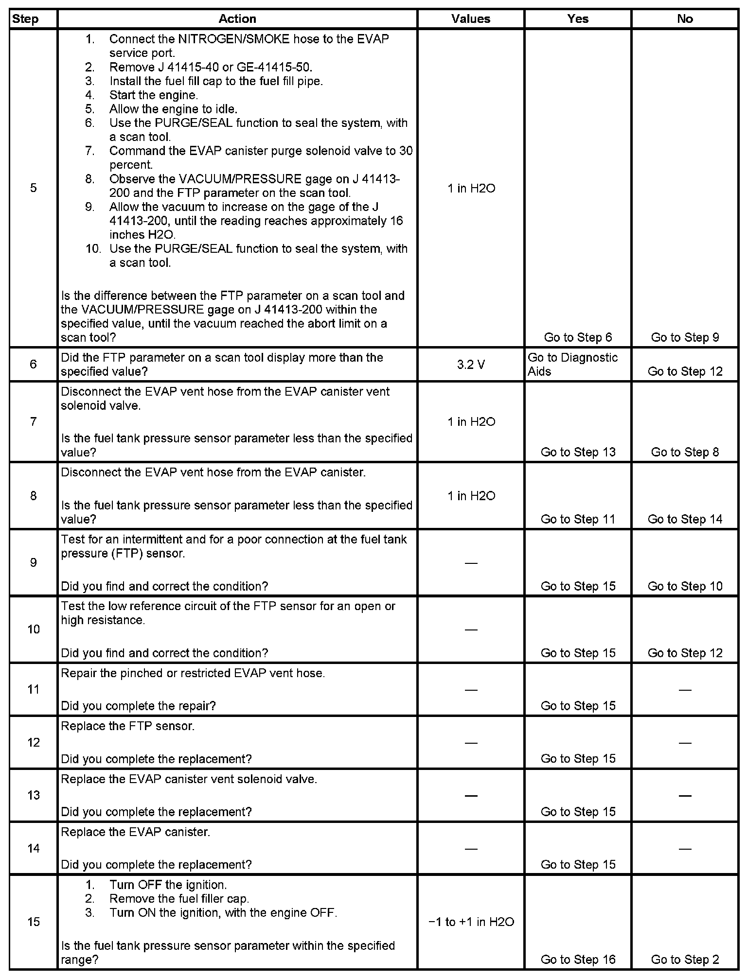 This DTC tests the Evaporative Emission (EVAP) System for a restricted or blocked EVAP vent path. The control module commands the EVAP canister purge solenoid valve Open and the EVAP canister vent solenoid valve Closed. This allows vacuum to be applied to the EVAP system. Once a calibrated vacuum level has been reached, the control module commands the EVAP canister purge solenoid valve Closed and the EVAP canister vent solenoid valve Open. The control module monitors the fuel tank pressure (FTP) sensor for a decrease in vacuum. If the vacuum does not decrease to near 0 inches H2O in a calibrated time, this DTC sets.