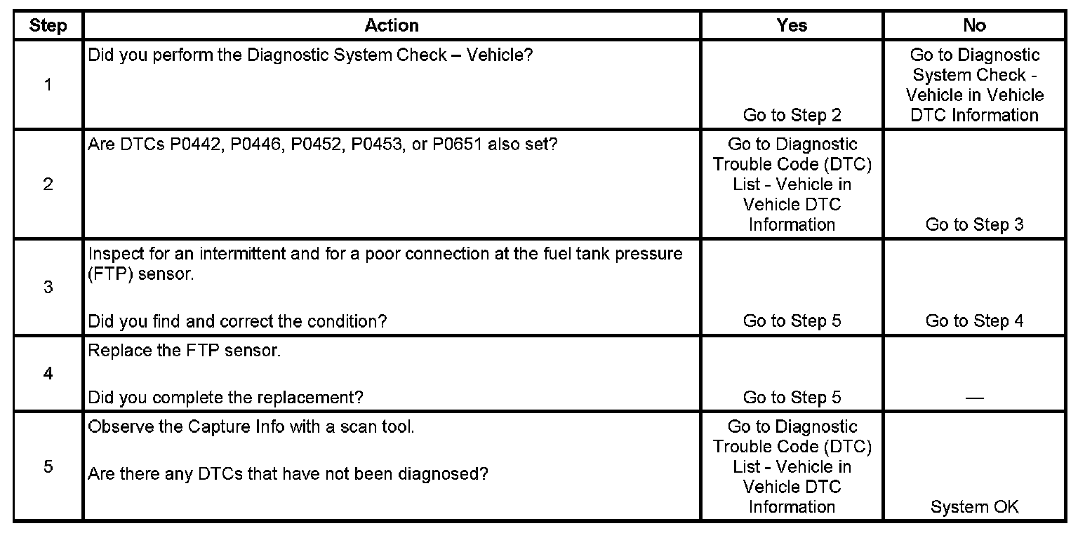 The fuel tank pressure (FTP) sensor measures air pressure or vacuum in the Evaporative Emission (EVAP) System. The control module supplies a 5-voltreference and a low reference circuit to the FTP sensor. The FTP sensor signal voltage varies depending on EVAP System pressure or vacuum. The controller uses this FTP signal to determine atmospheric pressure for use in the engine OFF small leak test, P0442. This DTC will set if the control module detects an intermittent signal from the FTP that would prevent the engine-off small leak test, P0442, from running.