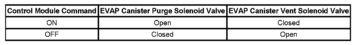 The table illustrates the relationship between the ON and OFF states, and the OPEN or CLOSED states of the EVAP canister purge and vent solenoid valves.