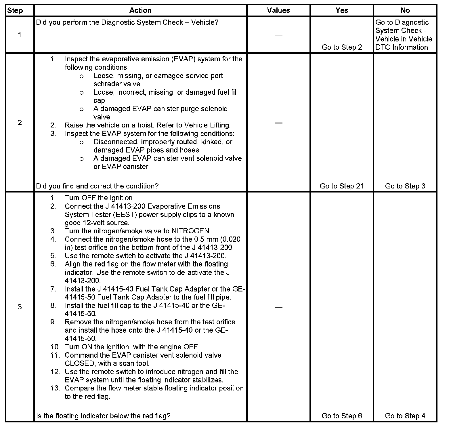 The numbers below refer to the step numbers on the diagnostic table.