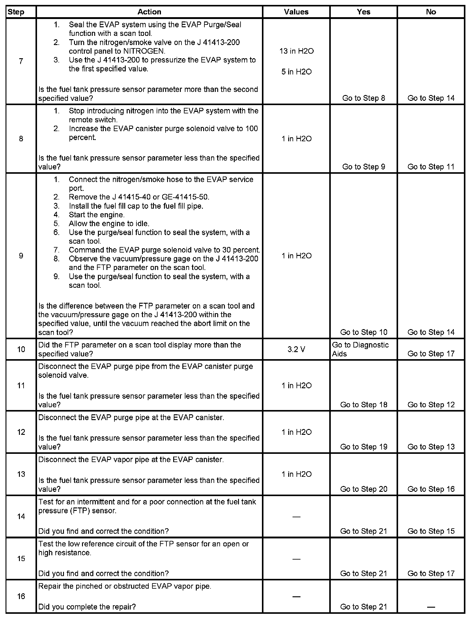 The control module tests the evaporative emission (EVAP) system for a large leak. The control module monitors the fuel tank pressure (FTP) sensor signal to determine the EVAP system vacuum level. When the conditions for running are met, the control module commands the EVAP canister purge solenoid valve open and the EVAP canister vent solenoid valve closed. This allows engine vacuum to enter the EVAP system. At a calibrated time, or vacuum level, the control module commands the EVAP canister purge solenoid valve closed, sealing the system, and monitors the FTP sensor input in order to determine the EVAP system vacuum level. If the system is unable to achieve the calibrated vacuum level, or the vacuum level decreases too rapidly, this DTC sets.