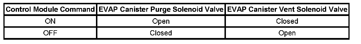 The table illustrates the relationship between the ON and OFF states, and the Open or Closed states of the EVAP canister purge and vent solenoid valves.