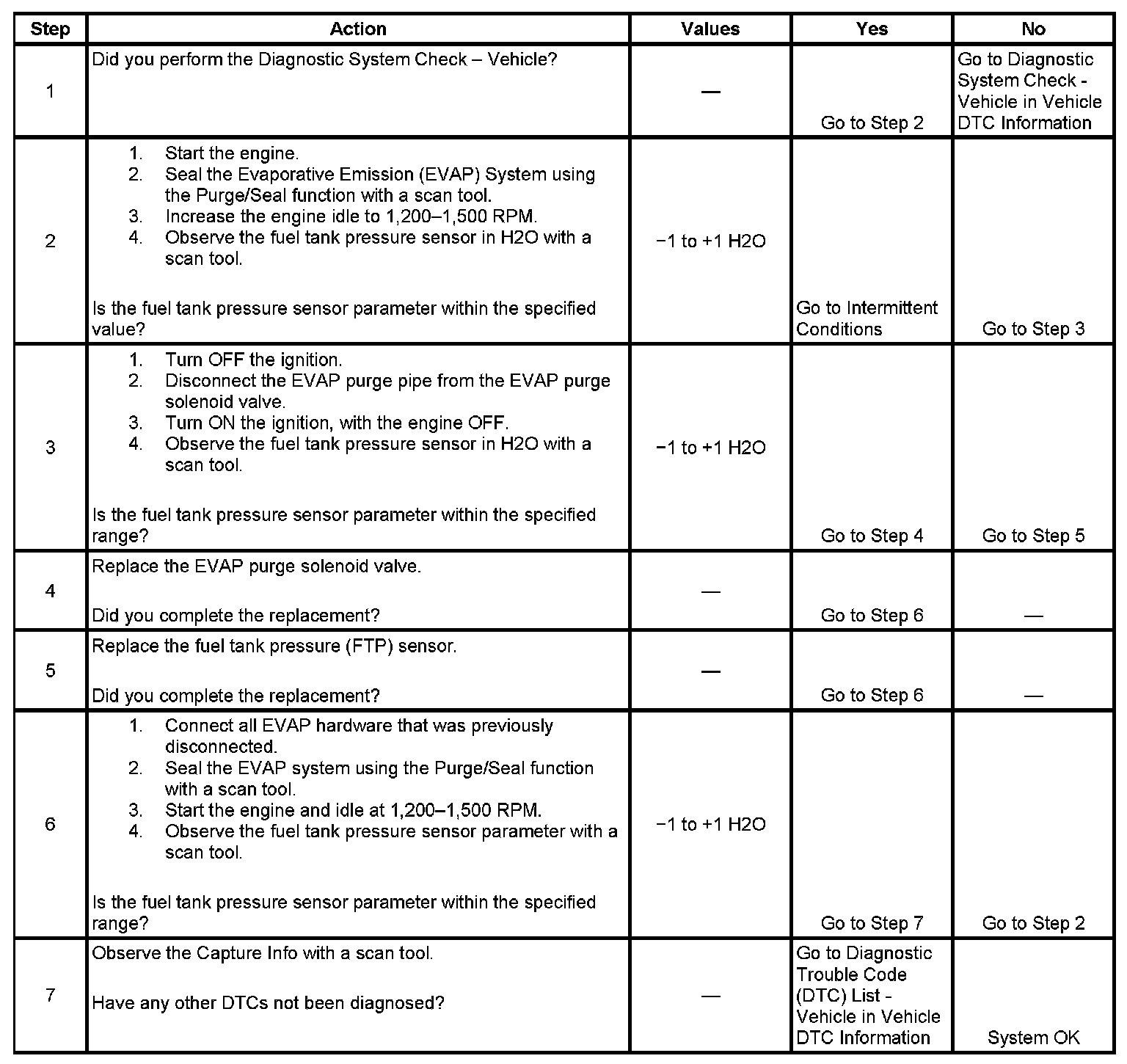 This DTC tests for undesired intake manifold vacuum flow to the Evaporative Emission (EVAP) System. The control module seals the EVAP system by commanding the EVAP canister purge solenoid valve Closed and the EVAP canister vent solenoid valve Closed. The control module monitors the fuel tank pressure (FTP) sensor to determine if a vacuum is being drawn on the EVAP system. If vacuum in the EVAP system is more than a predetermined value within a predetermined time, this DTC sets.