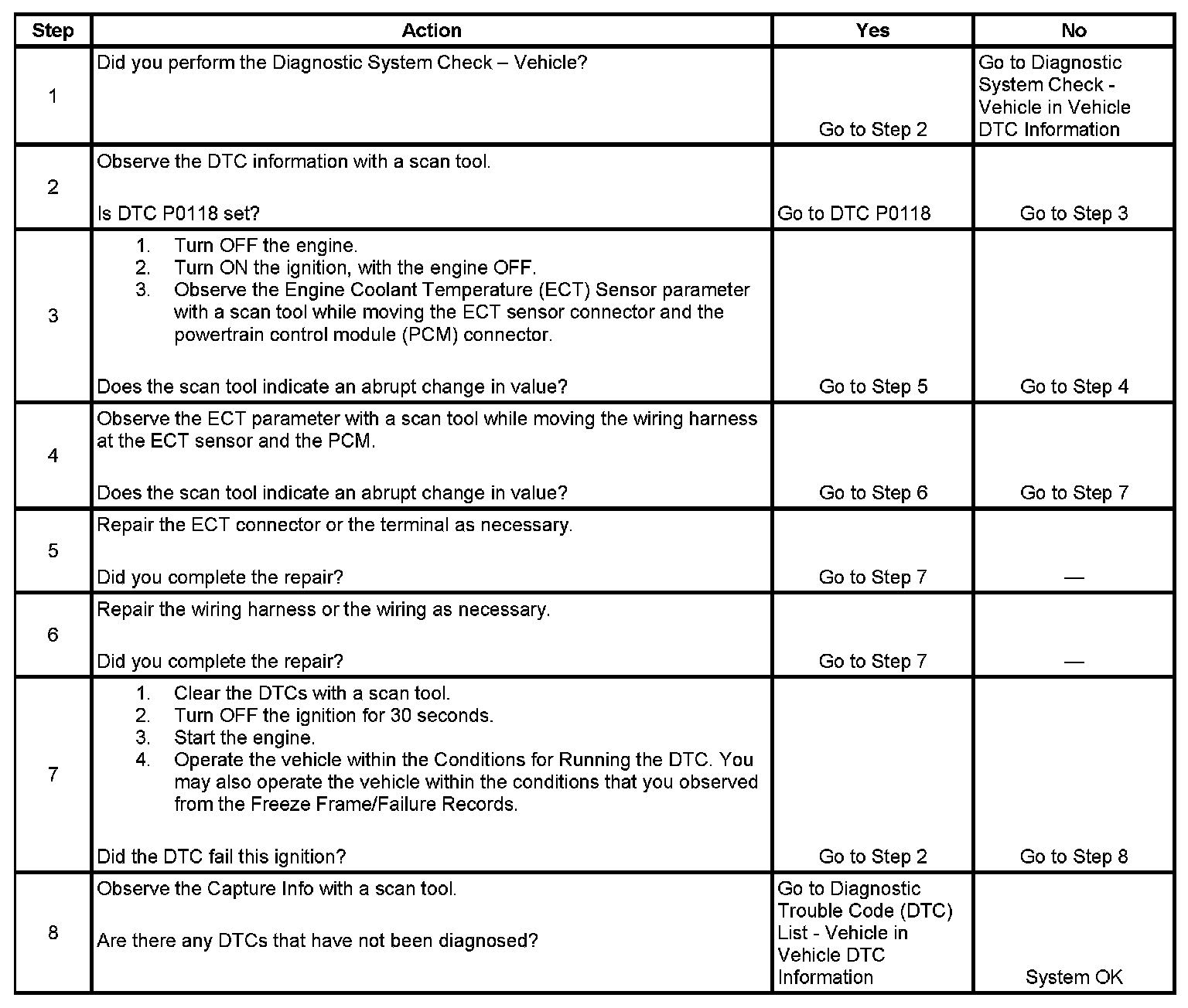 The engine coolant temperature (ECT) sensor is a variable resistor, that measures the temperature of the engine coolant. The powertrain control module (PCM) supplies 5 volts to the ECT signal circuit and a ground for the ECT low reference circuit. When the ECT is cold, the sensor resistance is high. When the ECT increases, the sensor resistance lowers. With high sensor resistance, the PCM detects a high voltage on the ECT signal circuit. With lower sensor resistance, the PCM detects a lower voltage on the ECT signal circuit. If the PCM detects an excessively high signal voltage, which is a low temperature indication, DTC P1115 sets.