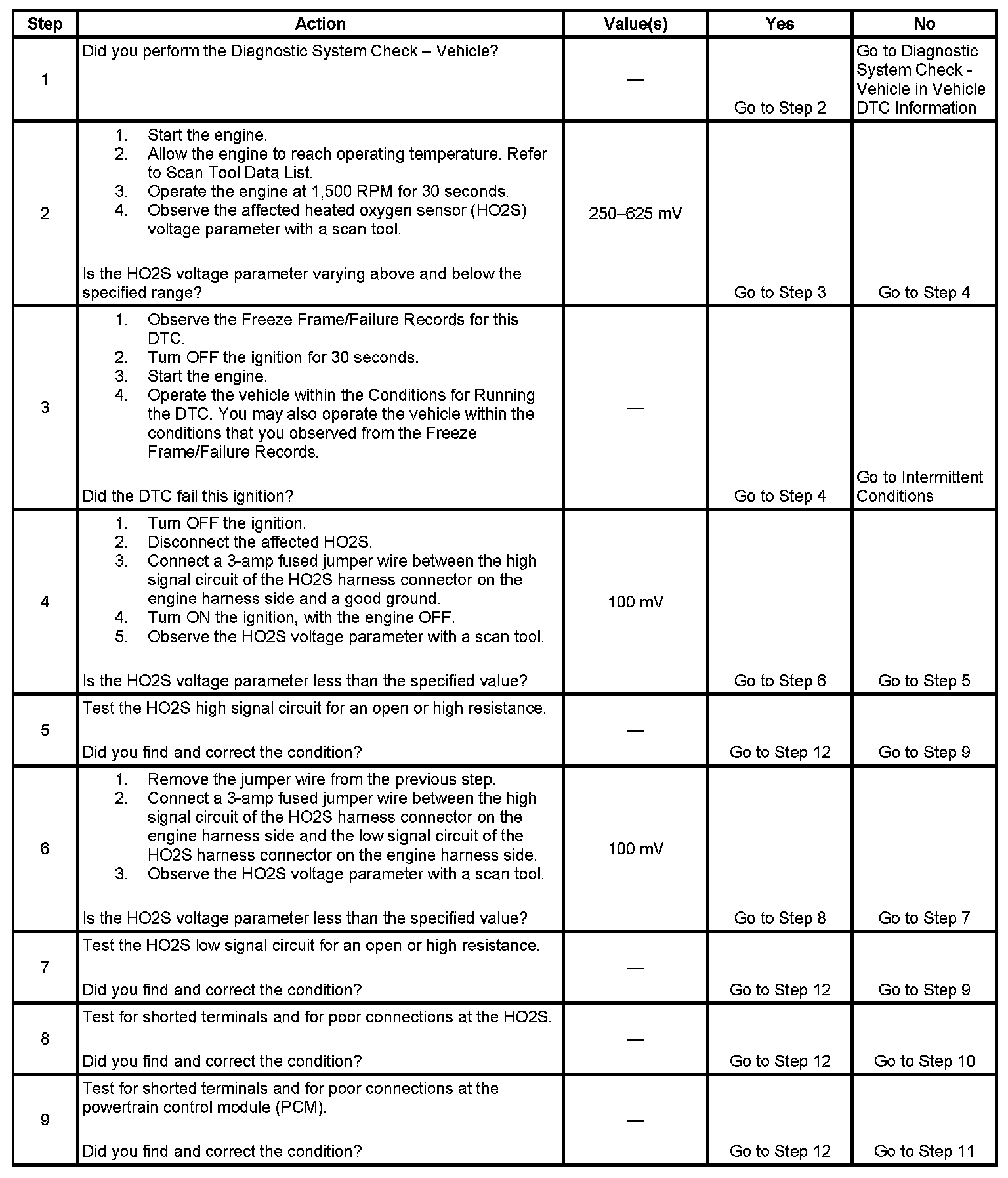 Heated oxygen sensors (HO2S) are used for fuel control and post catalyst monitoring. Each HO2S compares the oxygen content of the surrounding air with the oxygen content in the exhaust stream. The HO2S must reach operating temperature to provide an accurate voltage signal. Heating elements inside the HO2S minimize the time required for the sensors to reach operating temperature. The powertrain control module (PCM) supplies the HO2S with a reference, or bias, voltage of about 450 mV. When the engine is first started the PCM operates in open loop, ignoring the HO2S voltage signal. Once the HO2S reaches operating temperature and closed loop is achieved, the HO2S generates a voltage within a range of 0-1,000 mV that fluctuates above and below bias voltage. High HO2S voltage indicates a rich exhaust stream; low HO2S voltage indicates a lean exhaust stream. This diagnostic will only run once per ignition cycle. The PCM monitors the rich-to-lean and lean-to-rich transition time. A transition is defined as, the HO2S voltage changes from above 625 mV to below 250 mV or from below 250 mV to above 625 mV. If the PCM detects that the difference between the rich-to-lean average transition time and lean-to-rich average transition time is more than a specified value, DTC P1134 sets for HO2S bank 1 sensor 1, or DTC P1154 sets for HO2S bank 2 sensor 1.