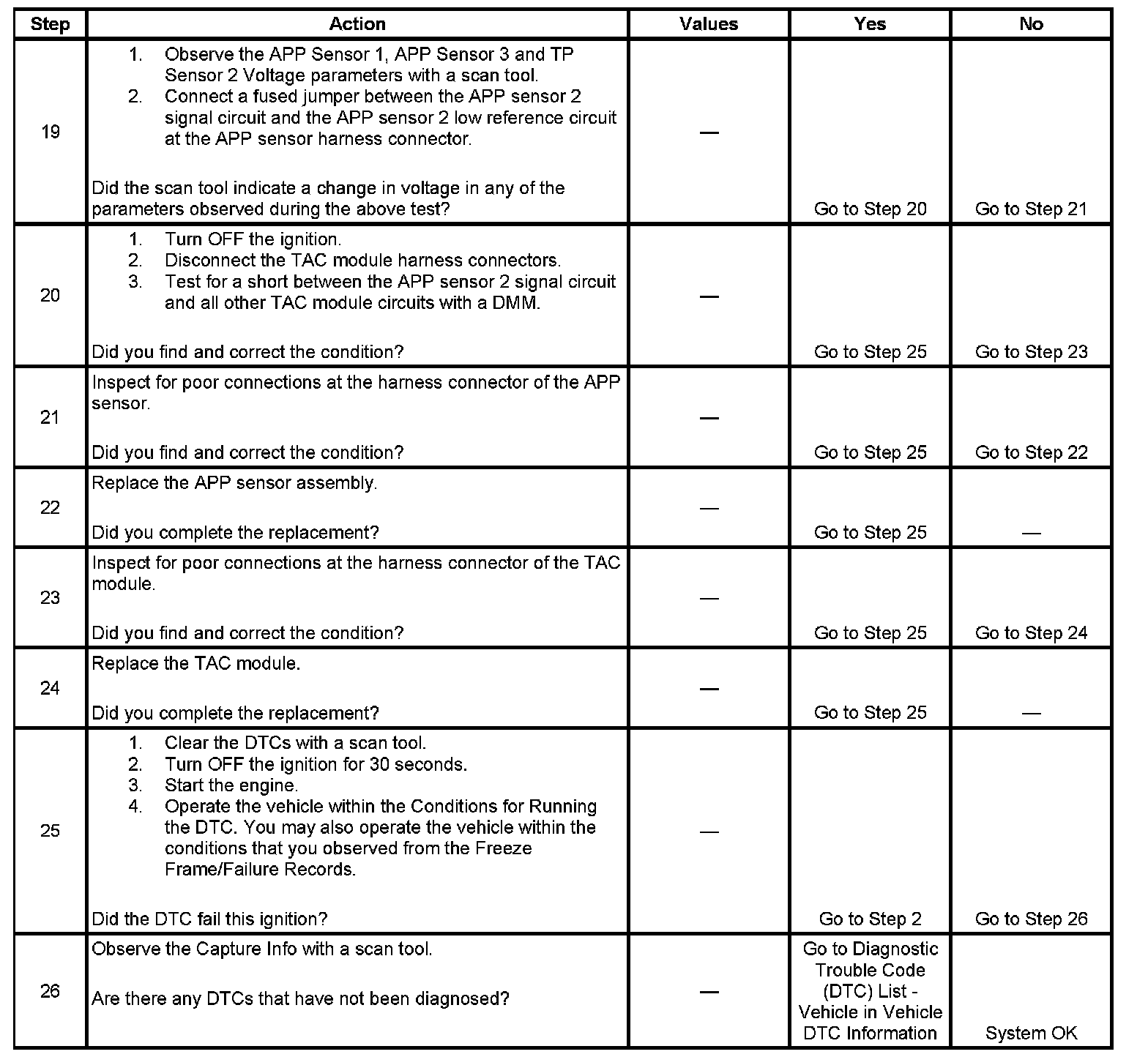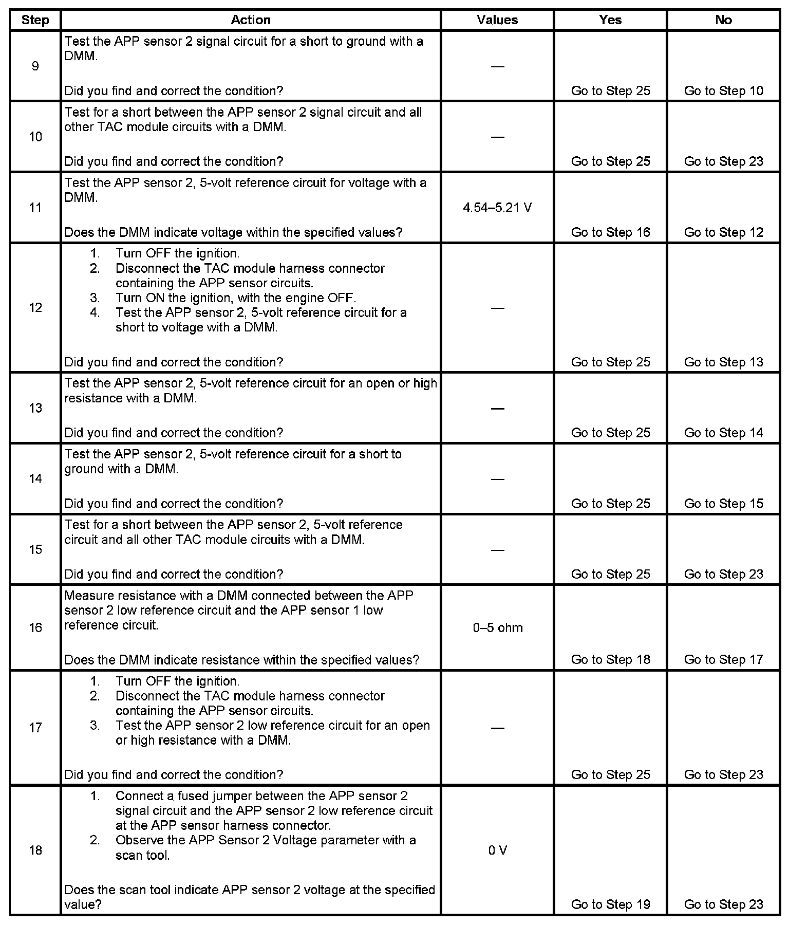 19. There are 2 separate 5-volt reference sources within the TAC module. The TP sensor 1 and the APP sensor 1 share one 5-volt reference source. The TP sensor 2 and the APP sensor 2 share another common 5-volt reference source. This test determines whether the signal circuit is shorted to any one of the 5-volt reference circuits. If a short exists, the corresponding sensor voltage will be pulled low.