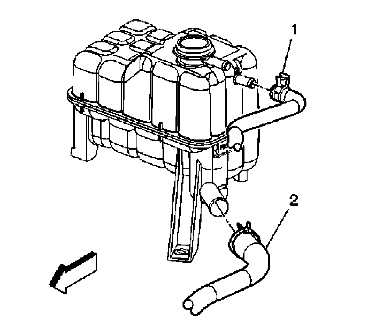 6. Remove the surge tank outlet hose (2) from the surge tank.