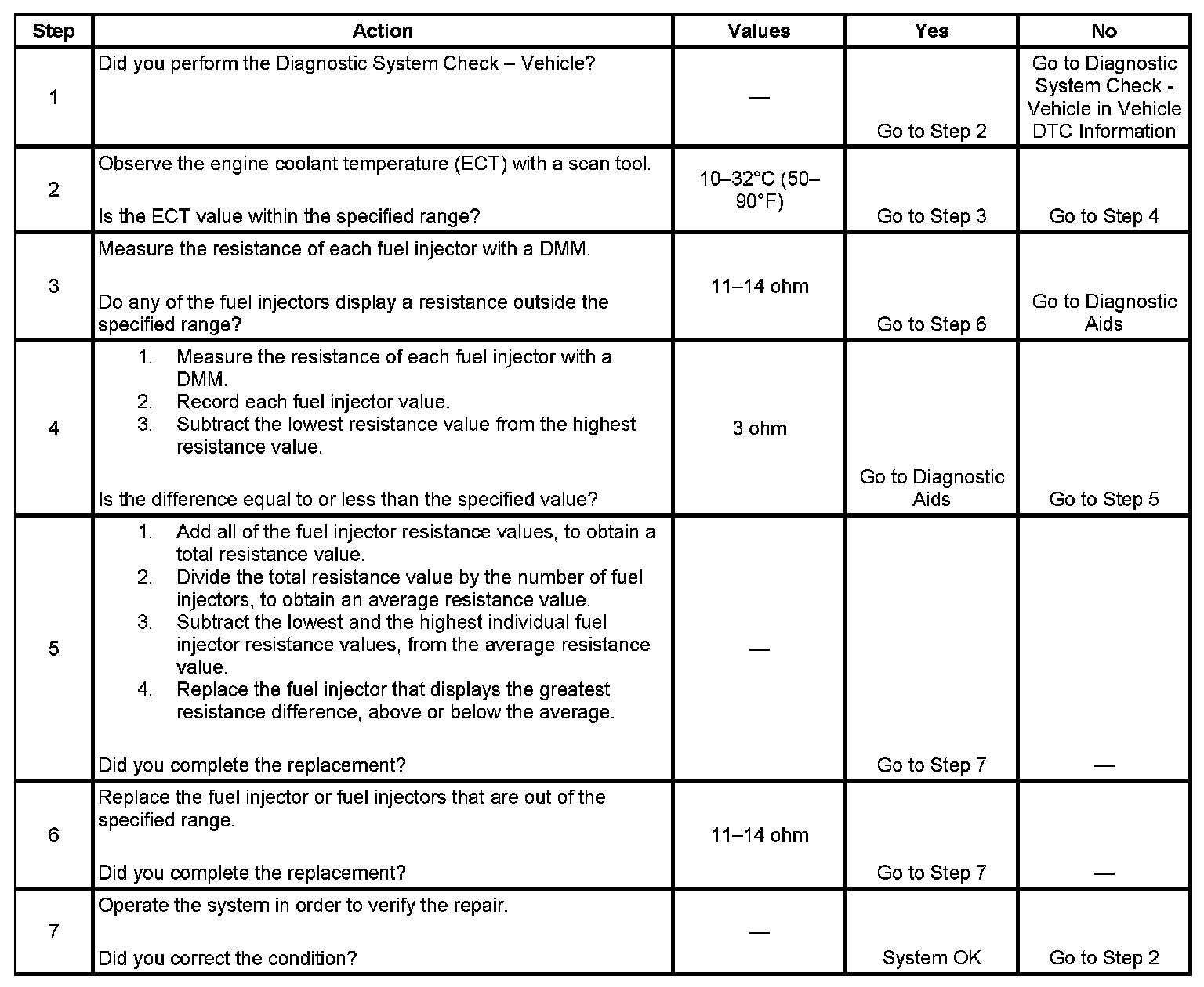 3. This step tests each fuel injector resistance within a specific temperature range. If any of the fuel injectors display a resistance outside of the specified value, replace the fuel injector.
