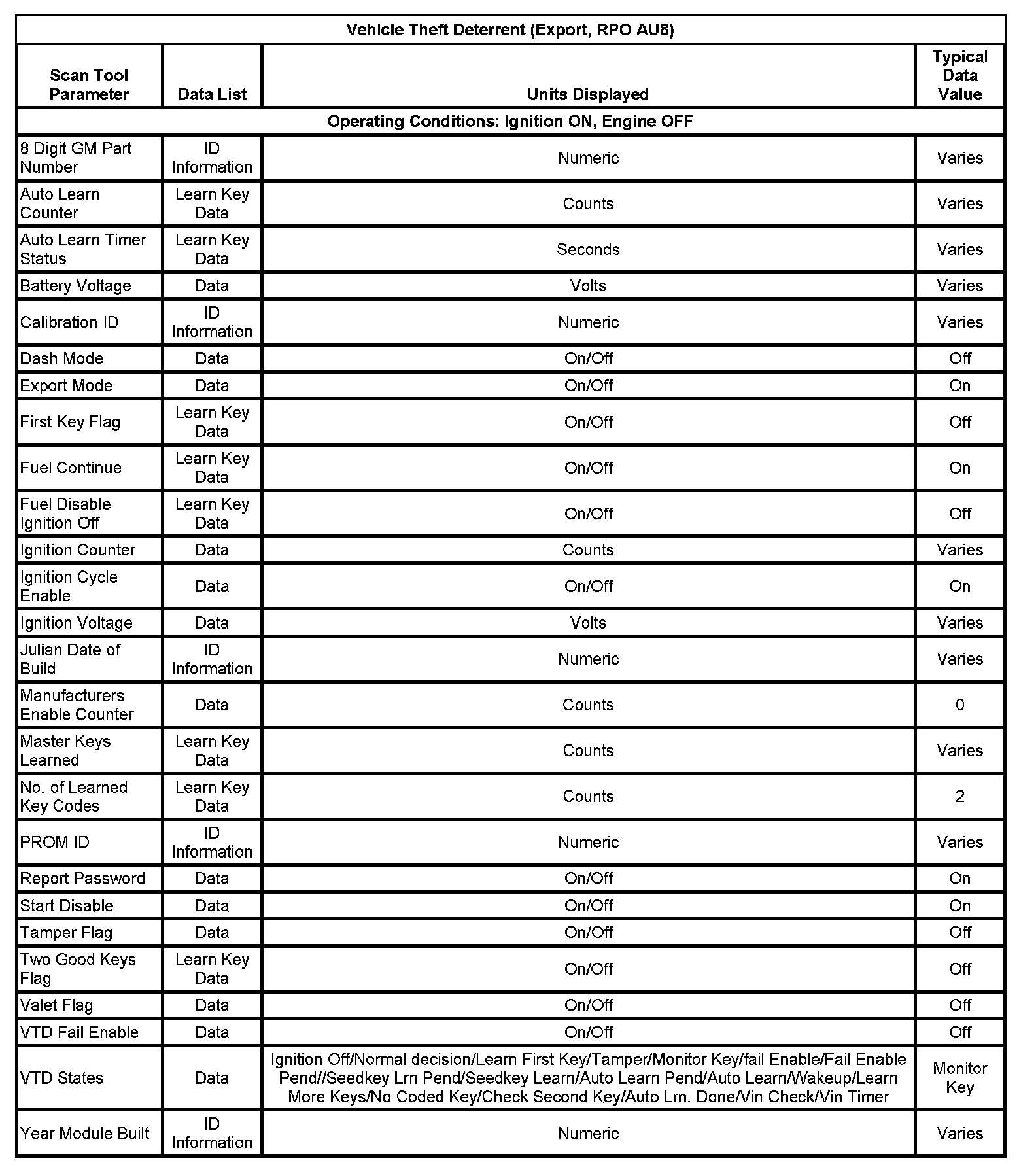 Vehicle Therft Deterrent (Export, RPO AU8):