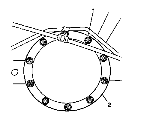 3. Remove the rear axle housing cover bolts (1). Discard the rear axle housing cover bolts.