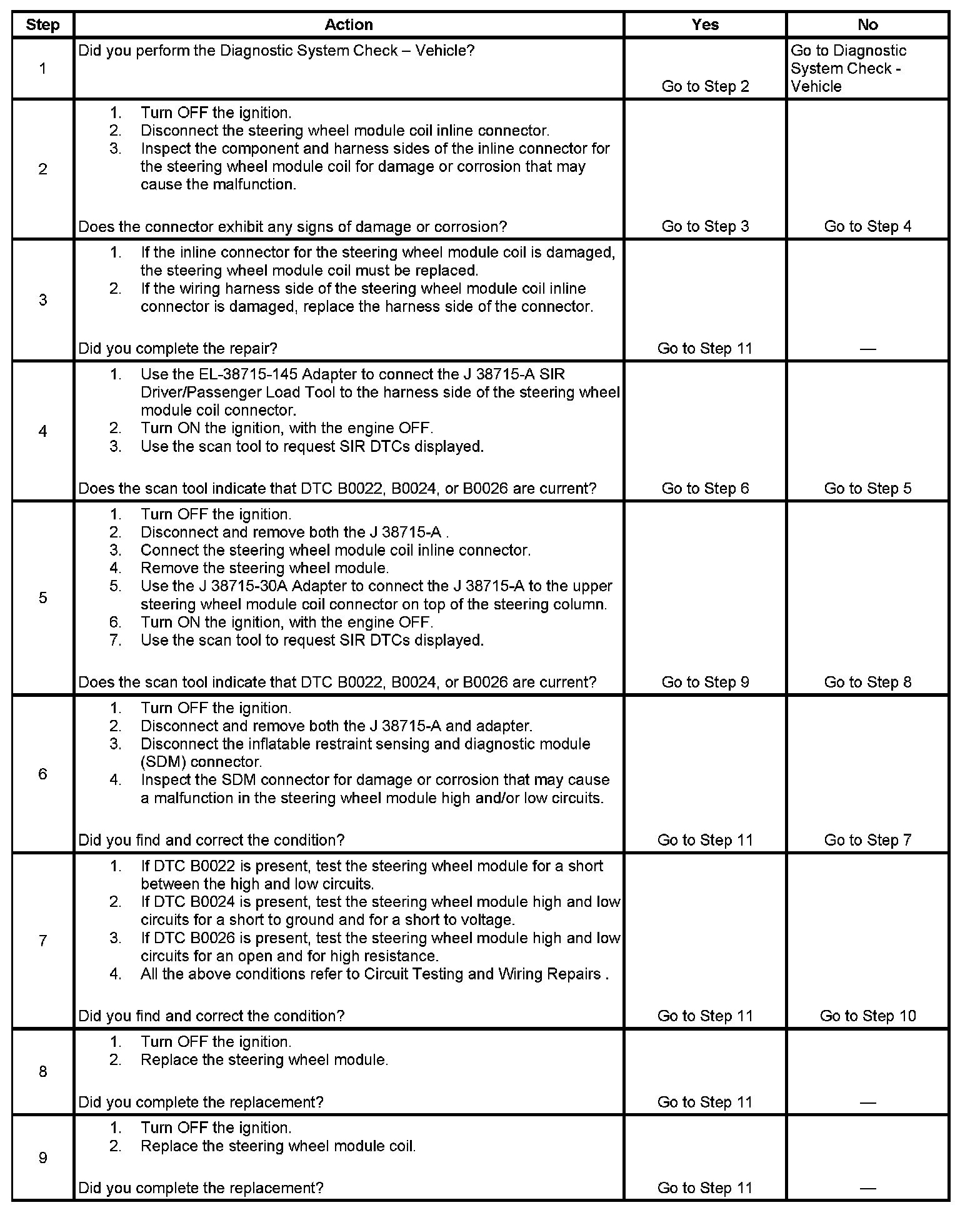 7. This step tests to see what DTCs are present. If DTC B0022 is present, test the steering wheel module for a short between high and low circuits. If DTC B0024 is present, test the steering wheel module high and low circuits for an open and for high resistance. If DTC B0026 is present, test the steering wheel module high and low circuits for an open and for high resistance.