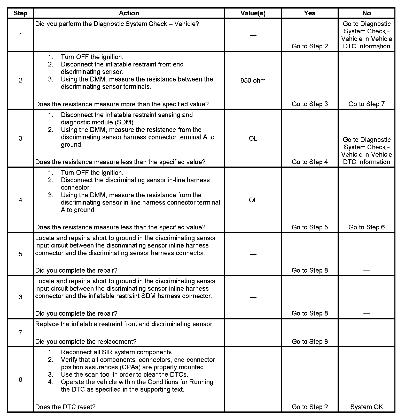 The inflatable restraint sensing and diagnostic module (SDM) monitors the front end discriminating sensor circuit for front impact detection. The SDM processes the signal provided by the front end discriminating sensor to further support deployment of the air bags. The front end discriminating sensor is an input only to the SDM and does not directly cause air bag deployment. When you first turn the ignition switch to the RUN position, the inflatable restraint SDM performs tests to diagnose critical malfunctions within itself. The SDM then performs the following continuous diagnostic tests on the deployment loops: