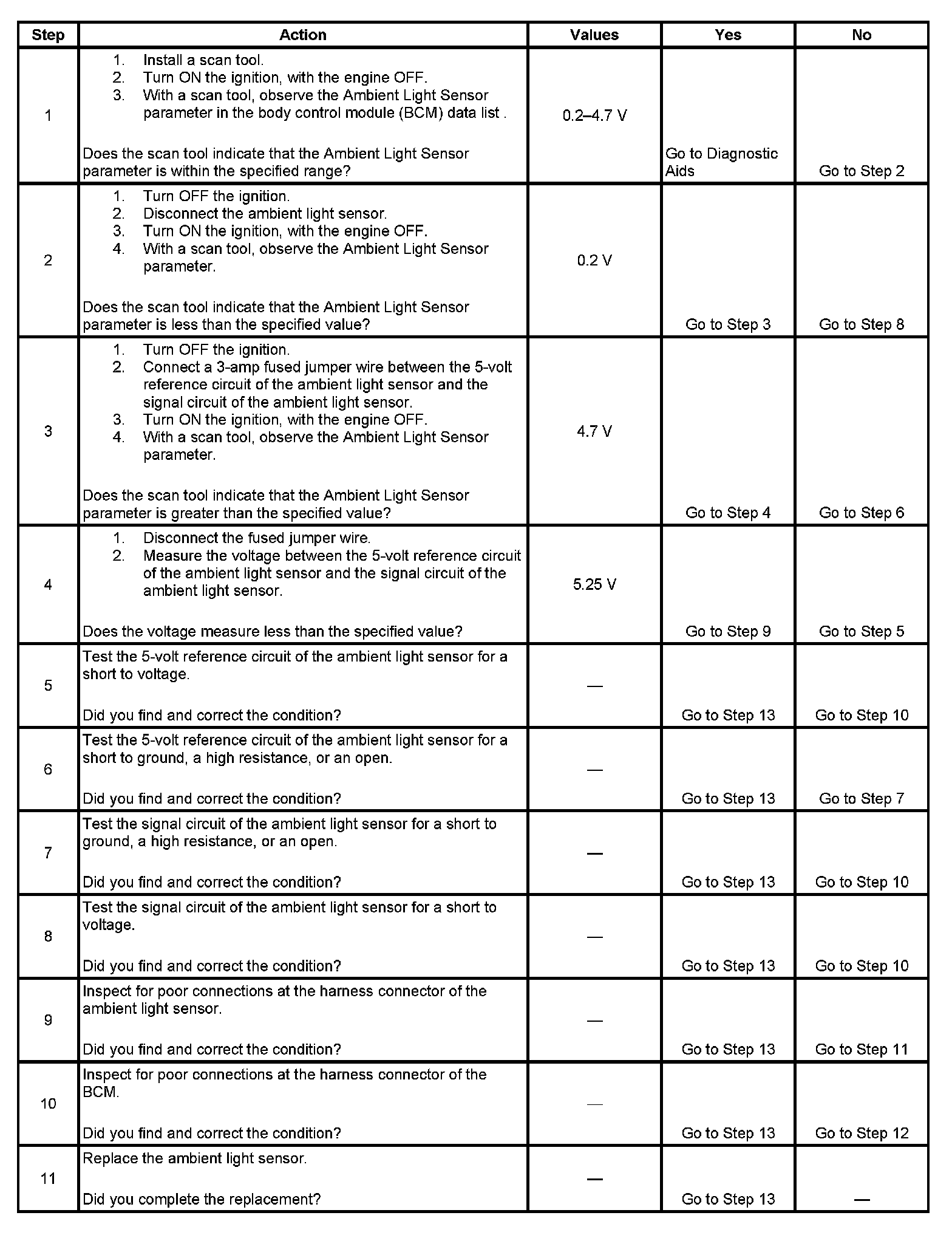 The body control module (BCM) provides a constant output reference voltage of 5 volts for the proper operation of the ambient light sensor. The constant output reference voltage supply ensures that variations in the output signal of the ambient light sensor are due to changes of the sensor rather than variations in the voltage supply. The BCM monitors the constant output reference voltage and sets a DTC when the output is not within the expected range of 4.75-5.25 volts.