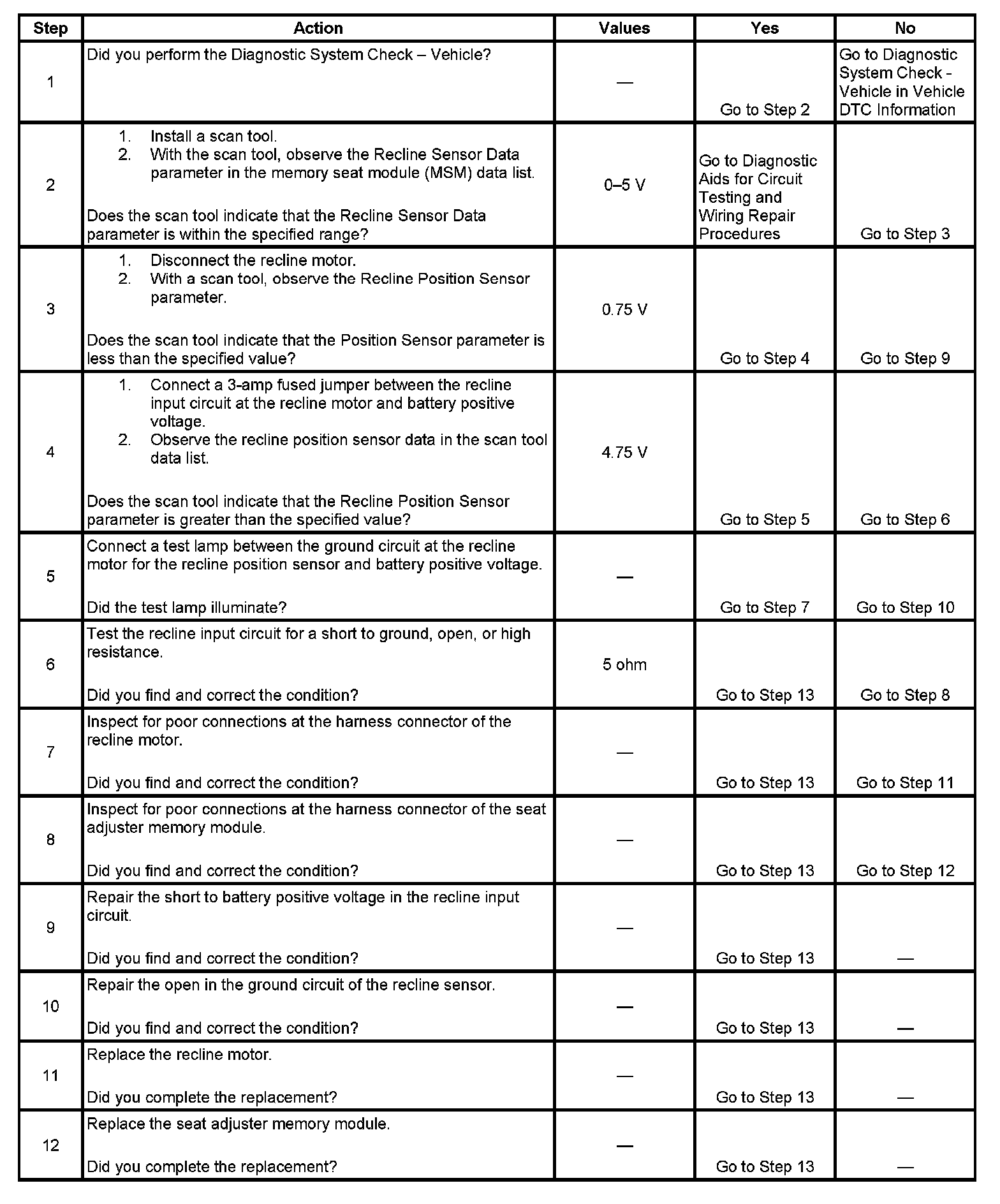 The recline seat motor is equipped with a internal hall effect sensor to determine seat position. The sensor is supplied with a reference voltage from the motor. A recline input circuit and ground circuit come from the memory seat module (MSM). The MSM receives a certain number of pulses from the sensor depending upon the position of the seat. The MSM then records the number of pulses so that the seat can be repositioned back to the same point that it was set at using the memory seat switches. The MSM then interprets the pulse input into a voltage reading for the data list on the scan tool.