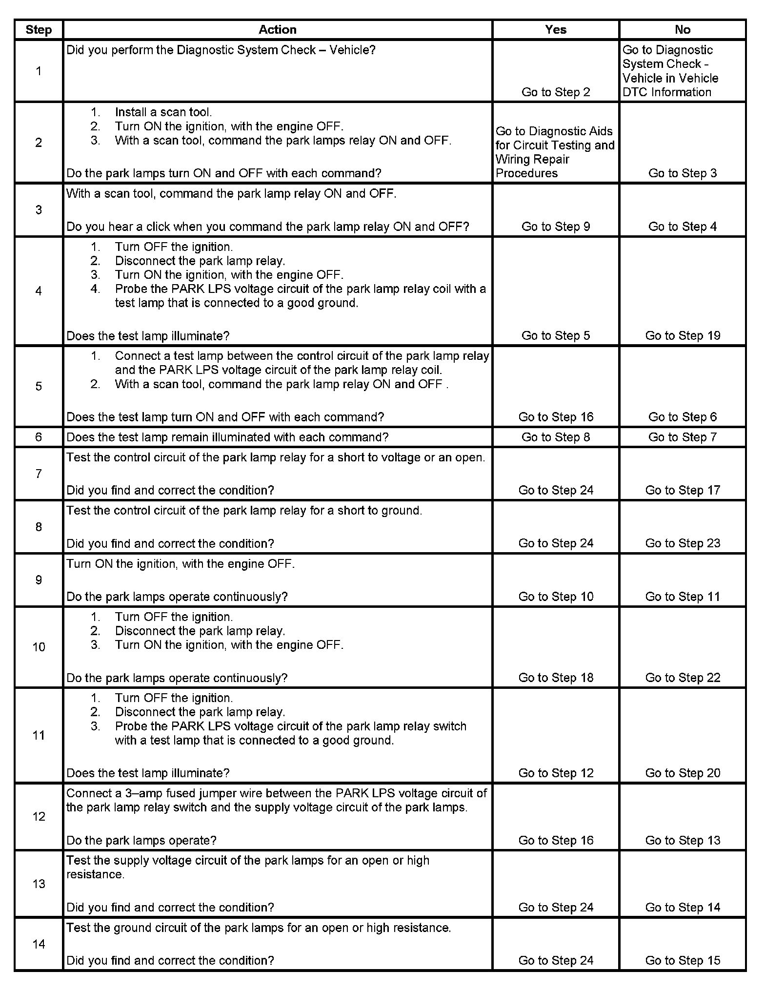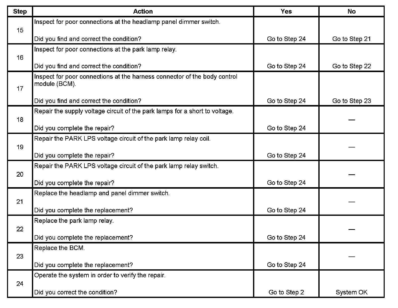 6. This step determines if a ground is constantly being applied to the park lamp relay.
