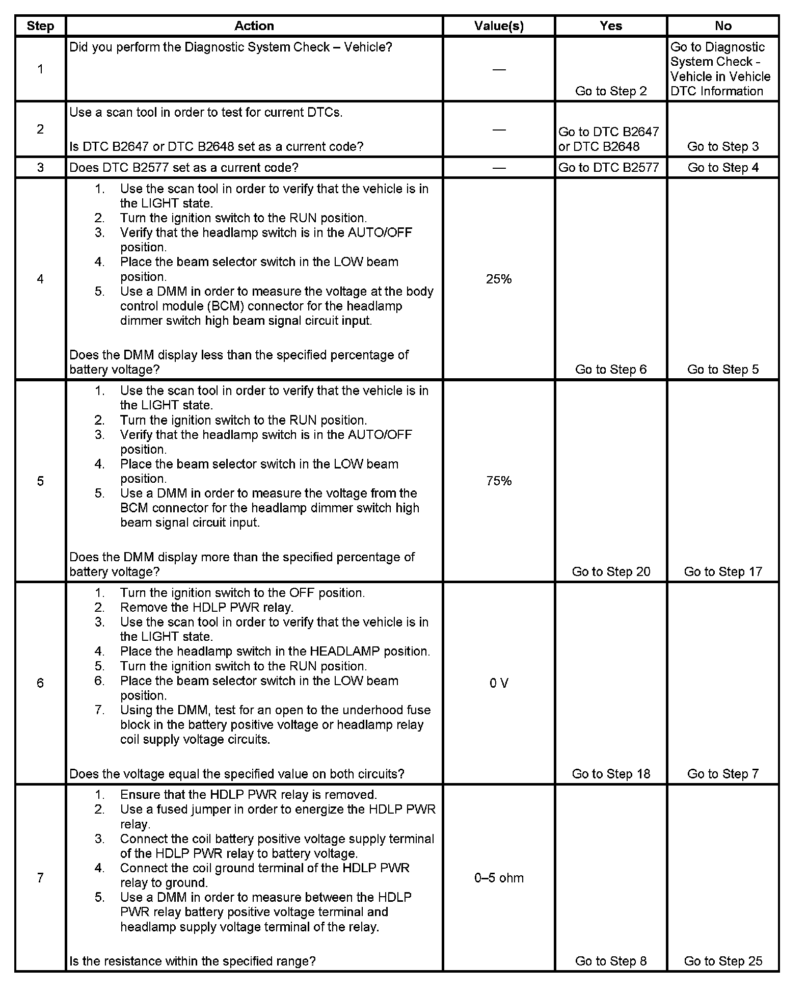 5. This step tests the headlamp dimmer switch high beam signal circuit for a short to battery voltage.